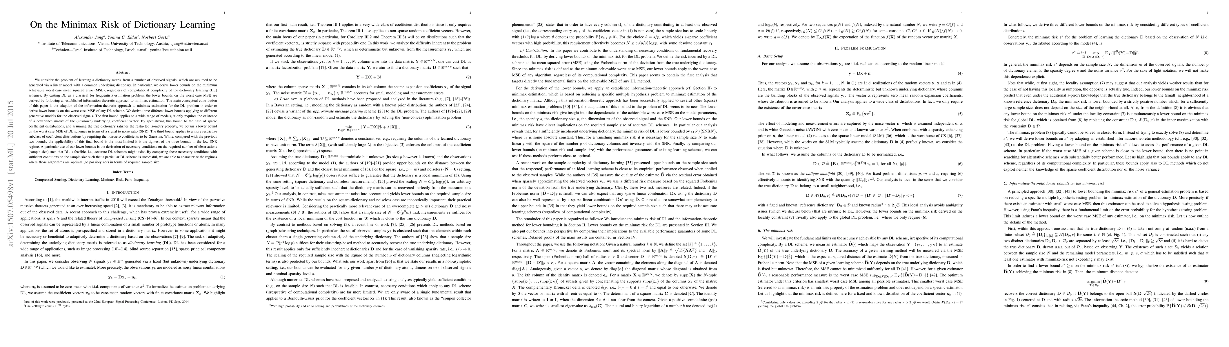 We consider the problem of learning a dictionary matrix from a number of observed signals, which are assumed to be generated via a linear model with a common underlying dictionary. In particular, we derive lower bounds on the minimum achievable worst case mean squared error (MSE), regardless of computational complexity of the dictionary learning (DL) schemes. By casting DL as a classical (or frequentist) estimation problem, the lower bounds on the worst case MSE are derived by following an established information-theoretic approach to minimax estimation. The main conceptual contribution of this paper is the adaption of the information-theoretic approach to minimax estimation for the DL problem in order to derive lower bounds on the worst case MSE of any DL scheme. We derive three different lower bounds applying to different generative models for the observed signals. The first bound applies to a wide range of models, it only requires the existence of a covariance matrix of the (unknown) underlying coefficient vector. By specializing this bound to the case of sparse coefficient distributions, and assuming the true dictionary satisfies the restricted isometry property, we obtain a lower bound on the worst case MSE of DL schemes in terms of a signal to noise ratio (SNR). The third bound applies to a more restrictive subclass of coefficient distributions by requiring the non-zero coefficients to be Gaussian. While, compared with the previous two bounds, the applicability of this final bound is the most limited it is the tightest of the three bounds in the low SNR regime.