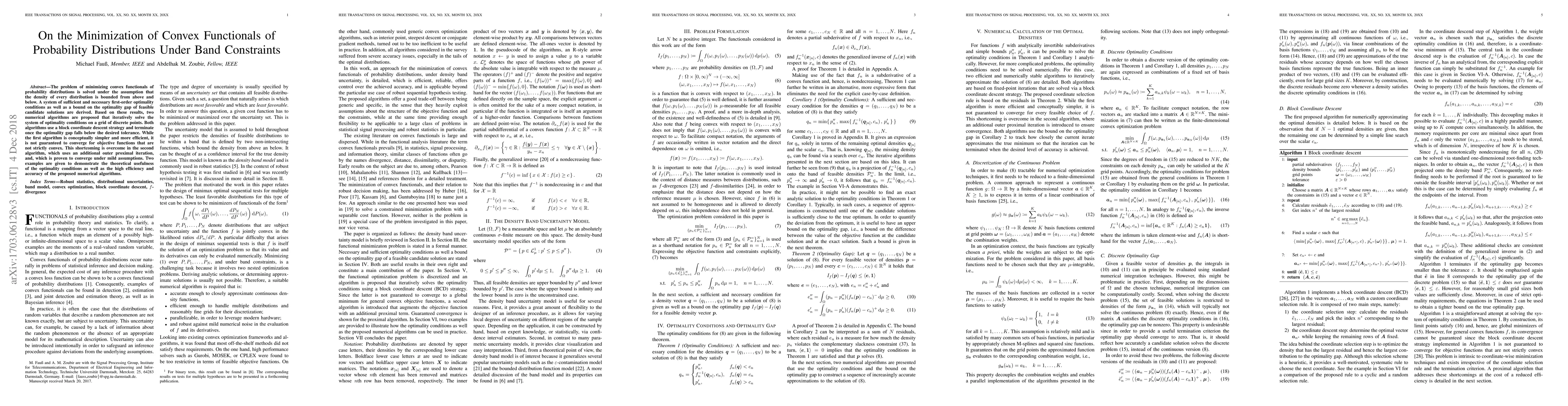 The problem of minimizing convex functionals of probability distributions is solved under the assumption that the density of every distribution is bounded from above and below. A system of sufficient and necessary first-order optimality conditions as well as a bound on the optimality gap of feasible candidate solutions are derived. Based on these results, two numerical algorithms are proposed that iteratively solve the system of optimality conditions on a grid of discrete points. Both algorithms use a block coordinate descent strategy and terminate once the optimality gap falls below the desired tolerance. While the first algorithm is conceptually simpler and more efficient, it is not guaranteed to converge for objective functions that are not strictly convex. This shortcoming is overcome in the second algorithm, which uses an additional outer proximal iteration, and, which is proven to converge under mild assumptions. Two examples are given to demonstrate the theoretical usefulness of the optimality conditions as well as the high efficiency and accuracy of the proposed numerical algorithms.