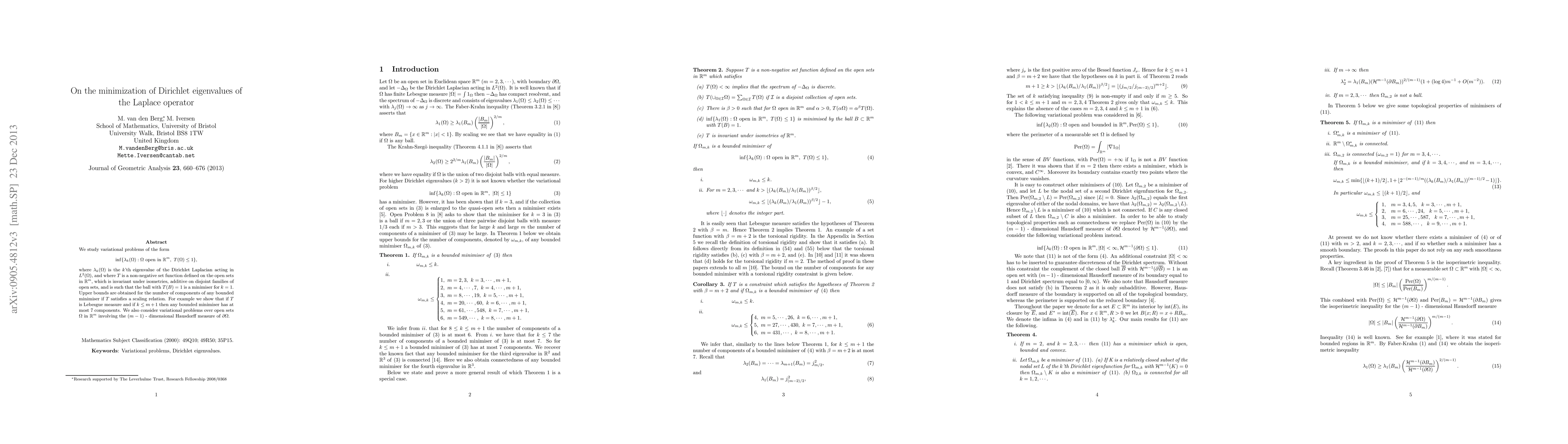 The paper studies how to minimize the $k$'th eigenvalue of the Dirichlet Laplacian in a given domain $ abla$, with constraints on the domain's boundary and size, finding that minimizers exist for specific cases and have certain properties.
