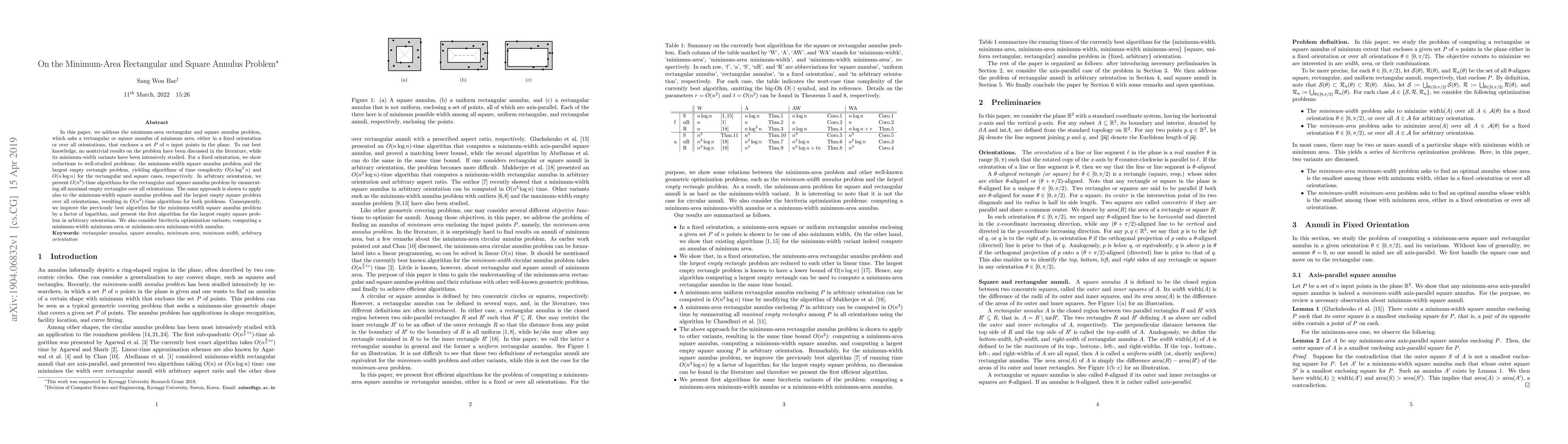 This paper tackles the minimum-area rectangular and square annulus problem, presenting algorithms for both fixed and arbitrary orientations. For fixed orientation, it reduces the problem to known issues, yielding efficient algorithms; for arbitrary orientation, it enumerates all maximal empty rectangles, resulting in $O(n^3)$-time solutions.