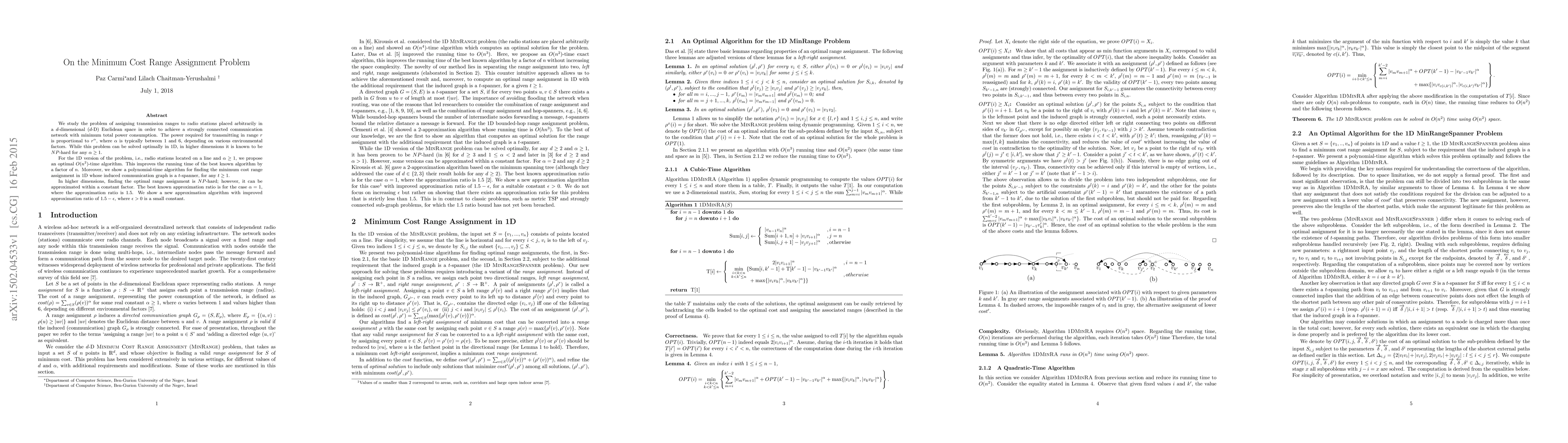 This research presents an optimal O(n^2)-time algorithm for the 1D Minimum Cost Range Assignment Problem, improving upon previous solutions. In higher dimensions, it's proven NP-hard but offers an approximation algorithm with a ratio of 1.5-u200bepsilon for u200balpha=1, enhancing upon the previous best ratio of 1.5.