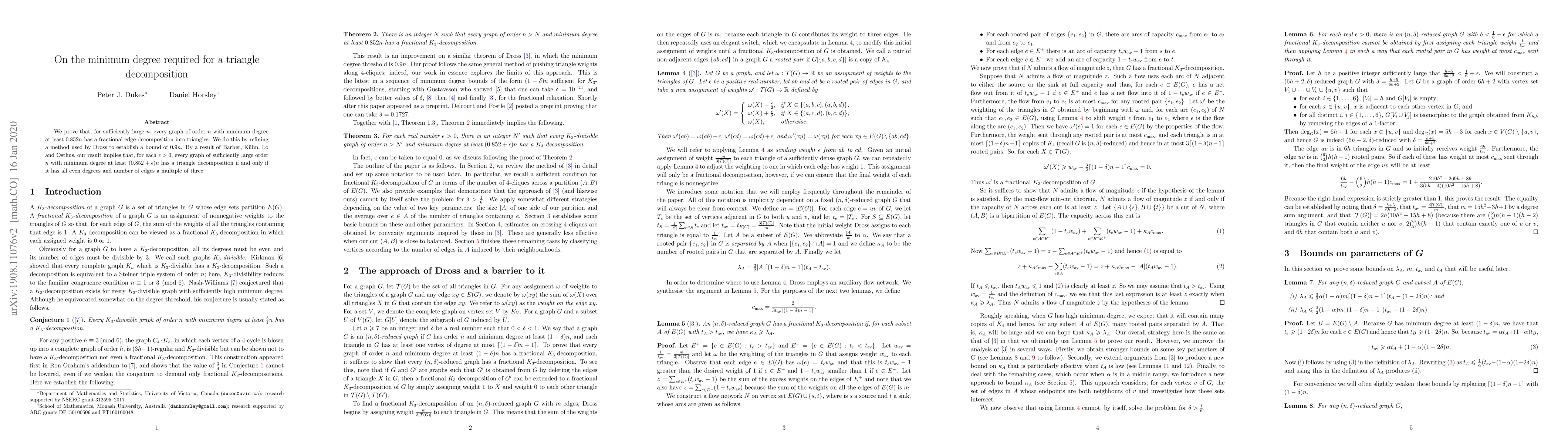This research proves that for sufficiently large graphs with a minimum degree of 0.852n, they can be decomposed into triangles. For even smaller degrees, certain conditions must be met to guarantee the decomposition.