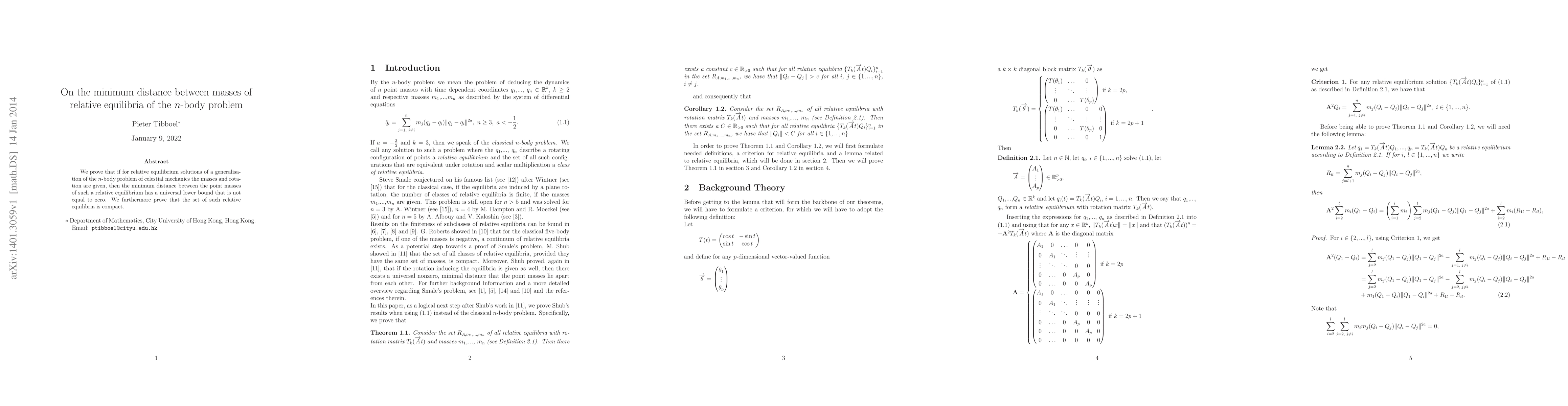 Summary: This paper proves a universal lower bound for the minimum distance between point masses in relative equilibria of a generalised $n$-body problem, showing it is non-zero, and demonstrates that the set of such equilibria is compact.