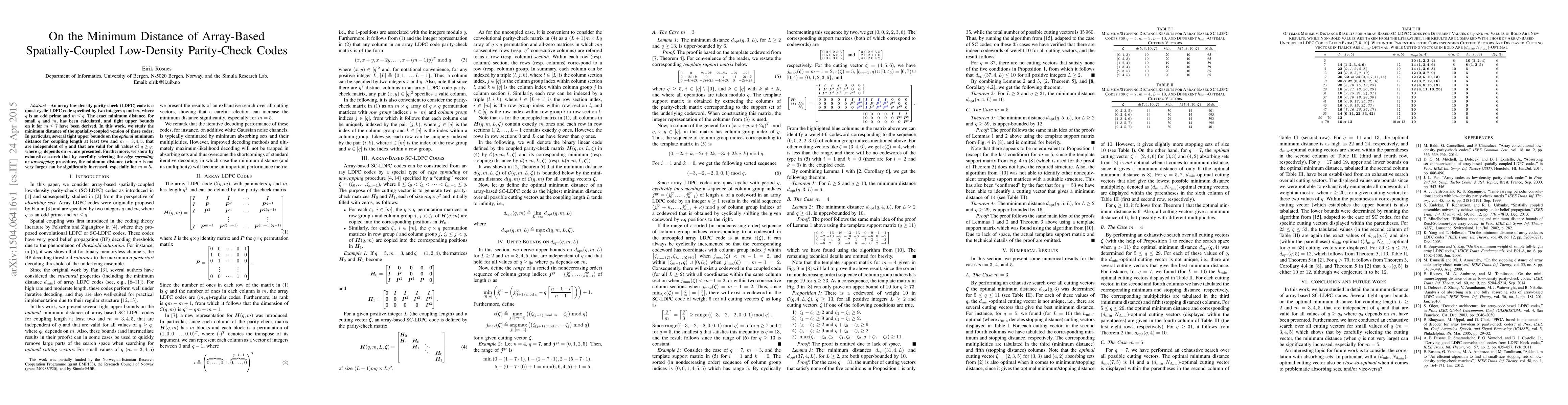 This paper investigates the minimum distance of spatially-coupled array-based LDPC codes, presenting tight upper bounds for coupling lengths and values of $m=3,4,5$. It also demonstrates that optimal edge spreading procedures can significantly enhance the minimum distance, particularly for $m=5$.