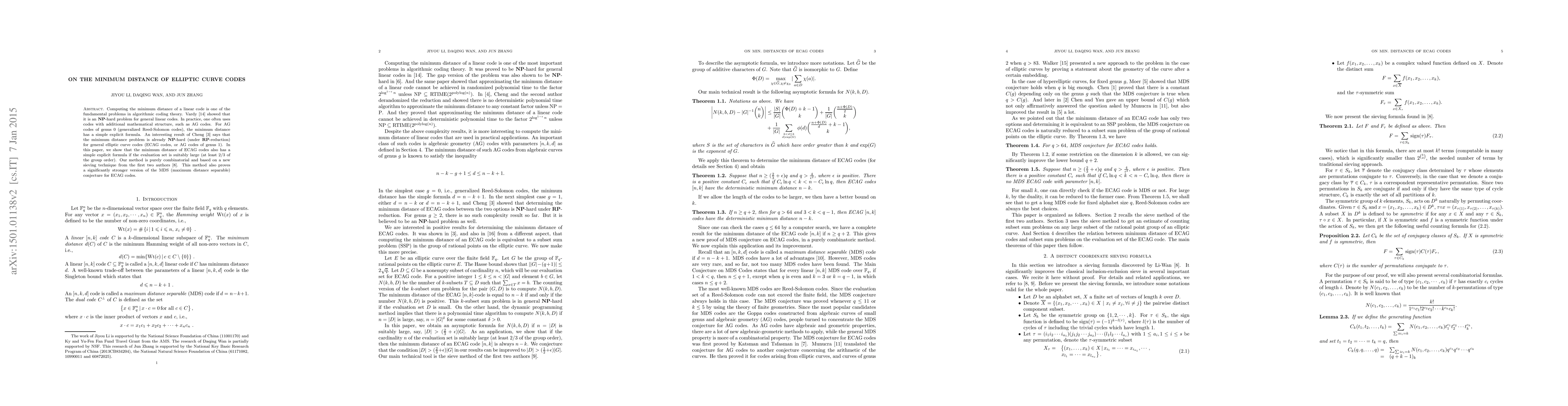 This paper demonstrates that the minimum distance of elliptic curve codes (ECAG codes) has an explicit formula when the evaluation set is sufficiently large, leveraging a combinatorial sieving technique. It also supports a stronger version of the MDS conjecture for these codes.
