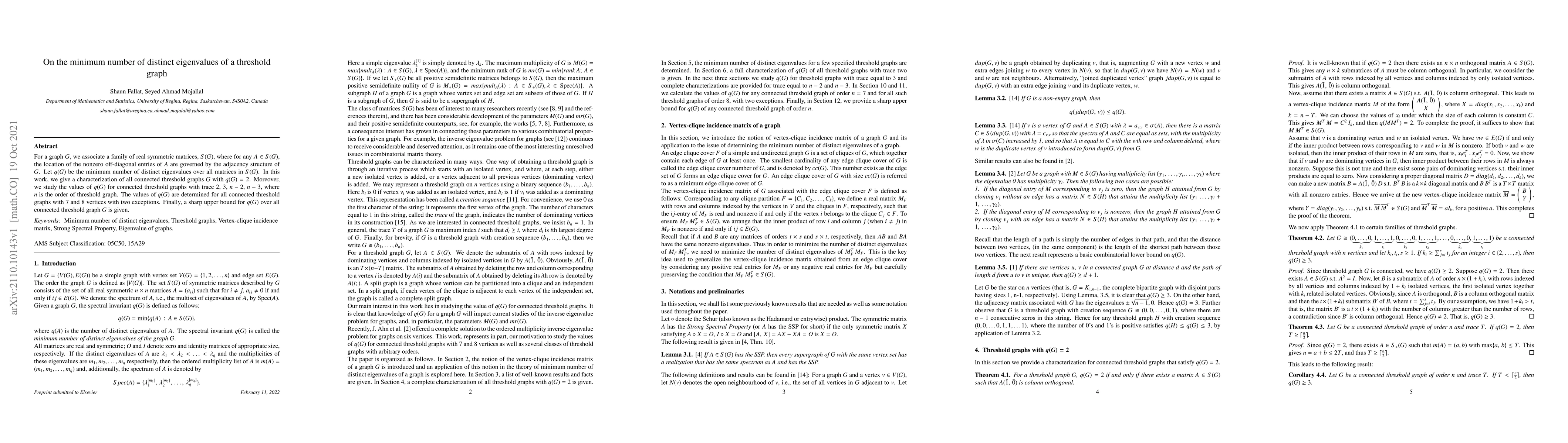 This paper characterizes connected threshold graphs with exactly two distinct eigenvalues among associated symmetric matrices and determines the values of $q(G)$ for specific connected threshold graphs, providing a sharp upper bound for all such graphs.