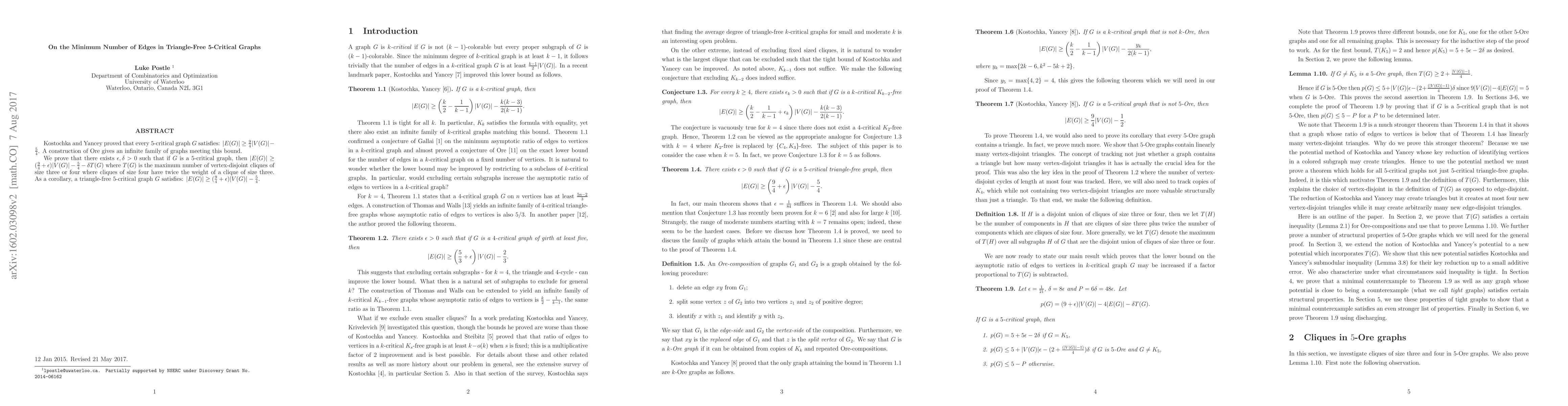 Kostochka and Yancey proved that every 5-critical graph G satisfies: |E(G)|>= (9/4)|V(G)| - 5/4. A construction of Ore gives an infinite family of graphs meeting this bound. We prove that there exists e,d > 0 such that if G is a 5-critical graph, then |E(G)| >= (9/4 + e)|V(G)|- 5/4 - dT(G), where T(G) is the maximum number of vertex-disjoint cliques of size three or four where cliques of size four have twice the weight of a clique of size three. As a corollary, a triangle-free 5-critical graph G satisfies: |E(G)|>=(9/4 + e)|V(G)| - 5/4.
