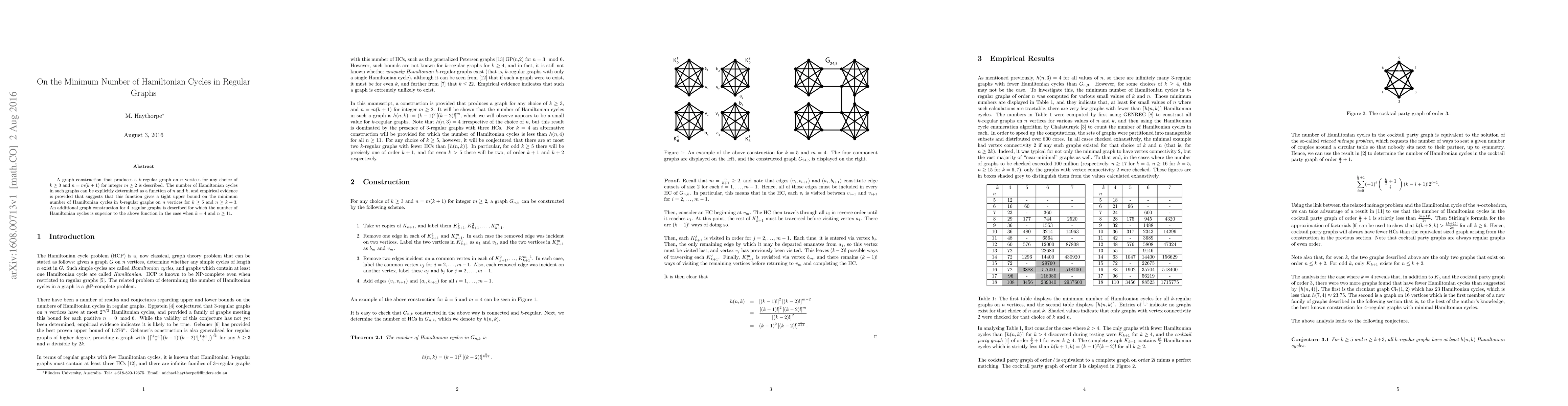 This paper constructs k-regular graphs for any k >= 3 and n = m(k+1), providing an explicit function for the number of Hamiltonian cycles in these graphs. The function is shown to tightly bound the minimum number of Hamiltonian cycles for k >= 5, with a special construction for 4-regular graphs that outperforms the function when k = 4 and n >= 11.