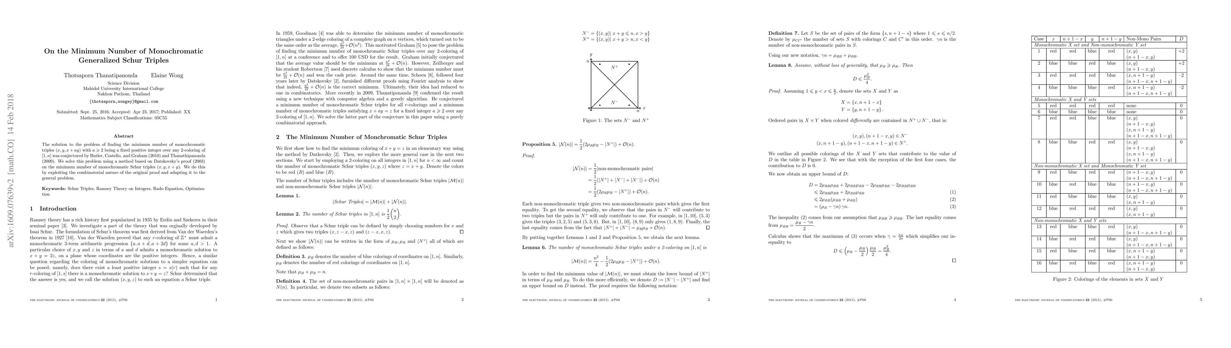 This paper resolves the conjecture on the minimum number of monochromatic generalized Schur triples $(x,y,x+ay)$ for $a \geq 2$ in any 2-coloring of $[1,n]$ by adapting Datskovsky's combinatorial method for the original Schur triples $(x,y,x+y)$.