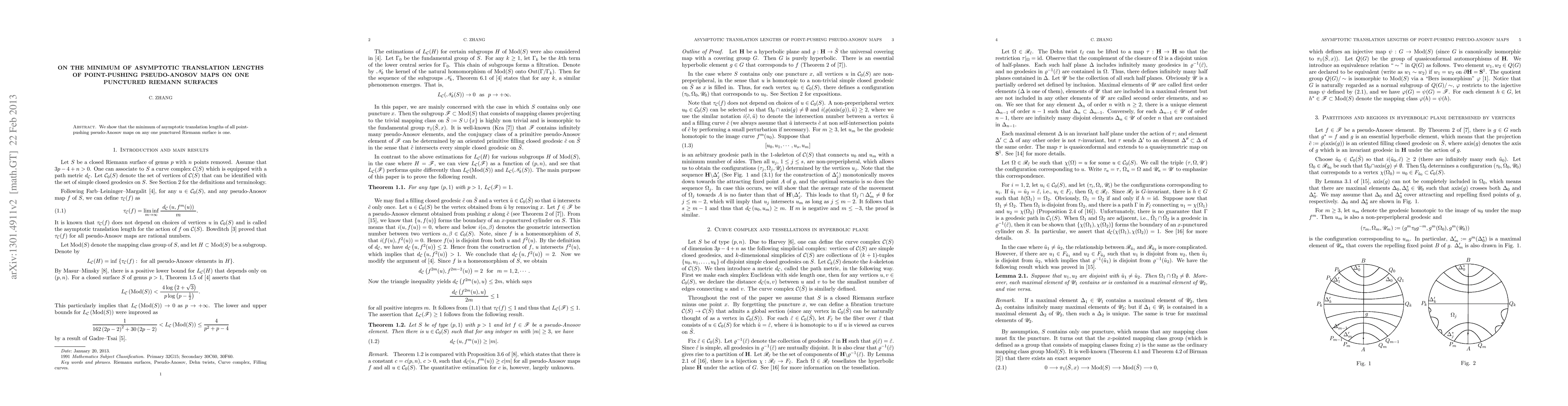 We show that the minimum of asymptotic translation lengths of all point-pushing pseudo-Anosov maps on any one punctured Riemann surface is one.