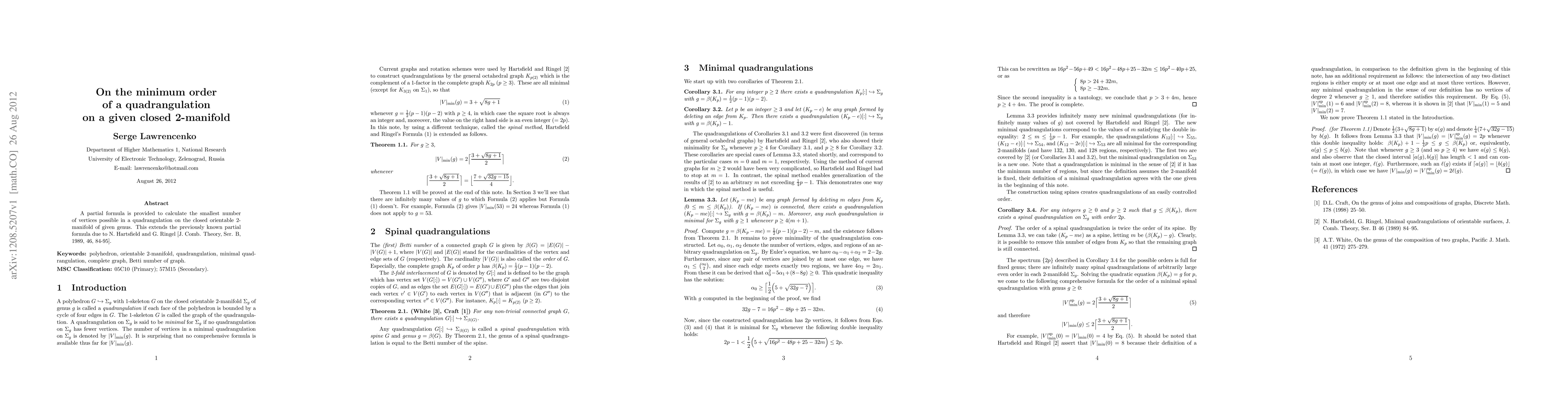 This research extends a previous formula by Hartsfield and Ringel, providing a method to calculate the minimum number of vertices for a quadrangulation on any closed orientable 2-manifold of given genus.