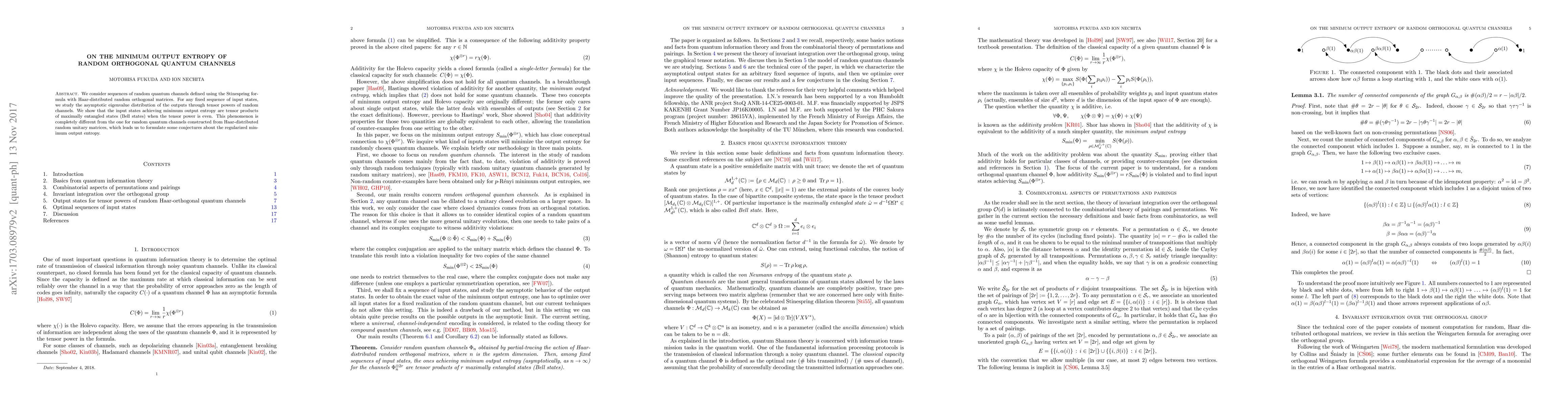 This paper investigates random orthogonal quantum channels and finds that for even tensor powers, the input states achieving minimum output entropy are tensor products of maximally entangled Bell states. This contrasts with channels constructed using Haar-distributed random unitary matrices, prompting new conjectures about regularized minimum output entropy.