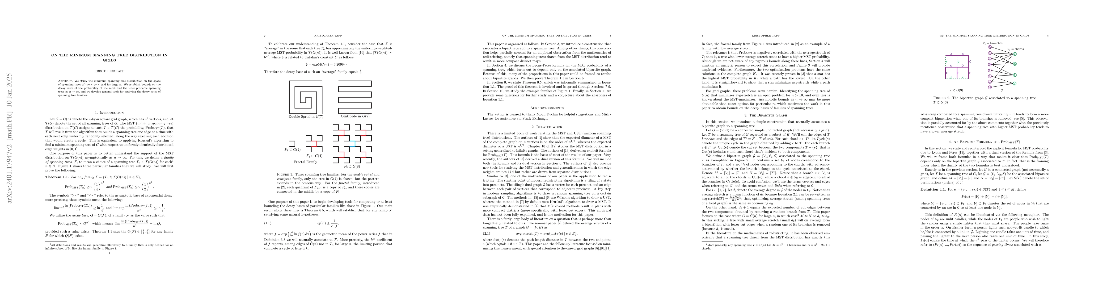 This paper investigates the distribution of minimum spanning trees in large $n$-by-$n$ grids, establishing bounds on the decay rates for the probabilities of the most and least probable spanning trees as $n$ approaches infinity.
