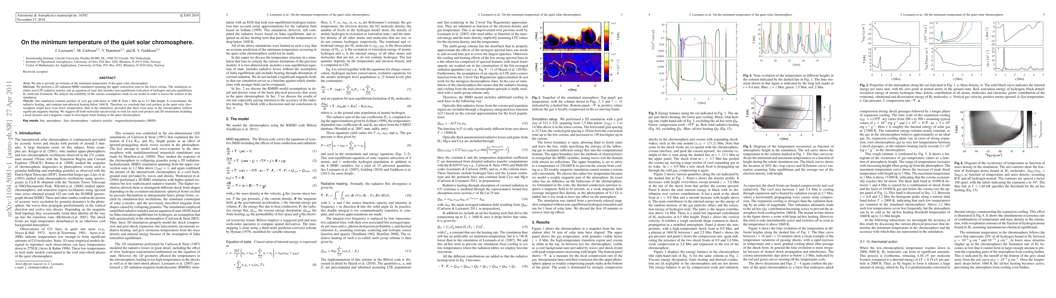aims: We aim to provide an estimate of the minimum temperature of the quiet solar chromosphere. methods: We perform a 2D radiation-MHD simulation spanning the upper convection zone to the lower corona. The simulation includes non-LTE radiative transfer and {an equation-of-state that includes non-equilibrium ionization of hydrogen and non-equilibrium H_2 molecule formation}. We analyze the reliability of the various assumptions made in our model in order to assess the realism of the simulation. results: Our simulation contains pockets of cool gas with down to 1660 K from 1 Mm up to 3.2 Mm height. It overestimates the radiative heating, and contains non-physical heating below 1660 K. Therefore we conclude that cool pockets in the quiet solar chromosphere might have even lower temperatures than in the simulation, provided that there exist areas in the chromosphere without significant magnetic heating. We suggest off-limb molecular spectroscopy to look for such cool pockets and 3D simulations including a local dynamo and a magnetic carpet to investigate Joule heating in the quiet chromosphere.