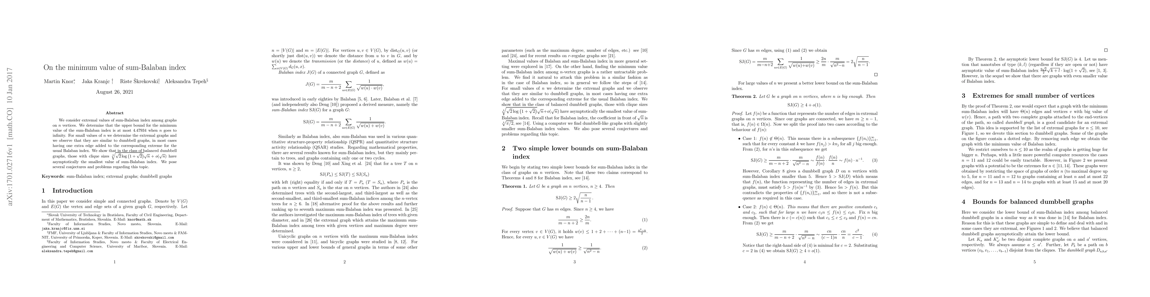 The paper presents a detailed analysis of the sum-Balaban index, deriving asymptotic bounds and identifying specific graph structures associated with its minimum value.