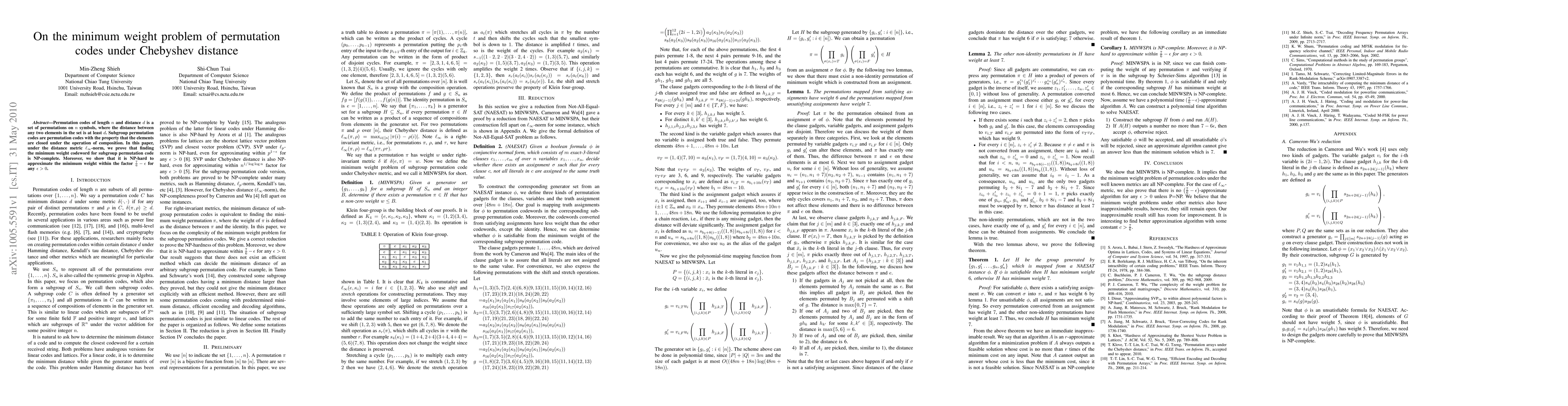 This paper proves that finding the minimum weight codeword for subgroup permutation codes under the Chebyshev distance is NP-complete. It also demonstrates that approximating the minimum weight within a factor of $7/6-\epsilon$ is NP-hard for any $\epsilon>0$.