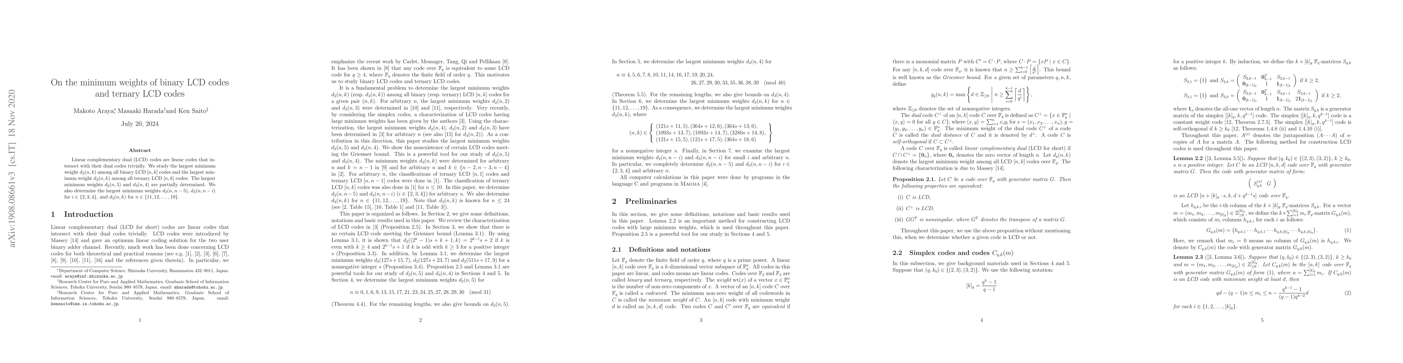 Linear complementary dual (LCD) codes are linear codes that intersect with their dual codes trivially. We study the largest minimum weight $d_2(n,k)$ among all binary LCD $[n,k]$ codes and the largest minimum weight $d_3(n,k)$ among all ternary LCD $[n,k]$ codes. The largest minimum weights $d_2(n,5)$ and $d_3(n,4)$ are partially determined. We also determine the largest minimum weights $d_2(n,n-5)$, $d_3(n,n-i)$ for $i \in \{2,3,4\}$, and $d_3(n,k)$ for $n \in \{11,12,\ldots,19\}$.