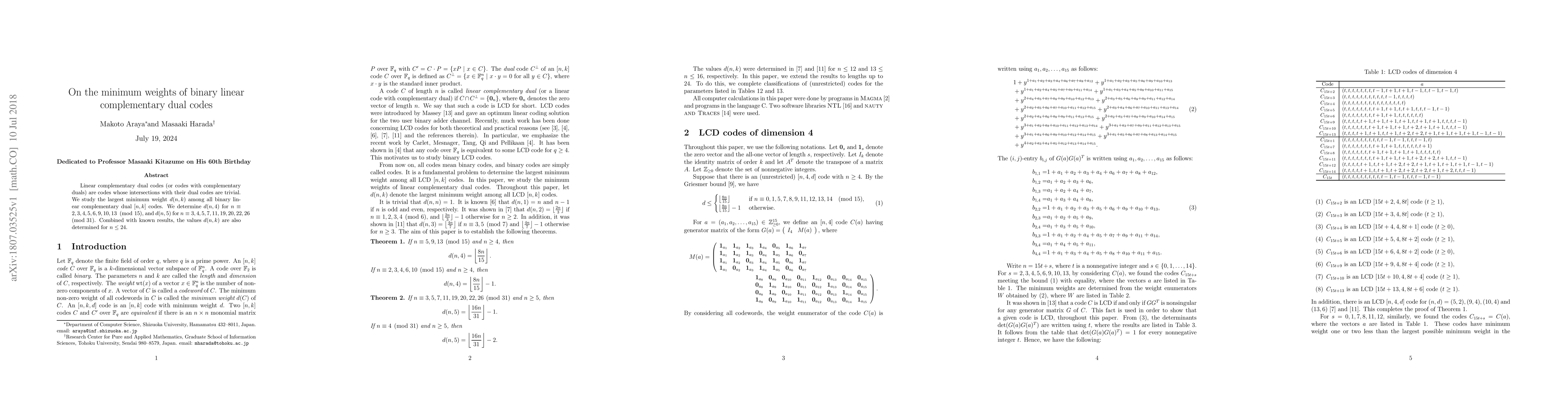 This paper investigates the largest minimum weight among binary linear complementary dual codes, determining $d(n,4)$ for specific $n$ values modulo 15 and $d(n,5)$ for several $n$ values modulo 31. It also consolidates known results to find $d(n,k)$ for $n$ up to 24.