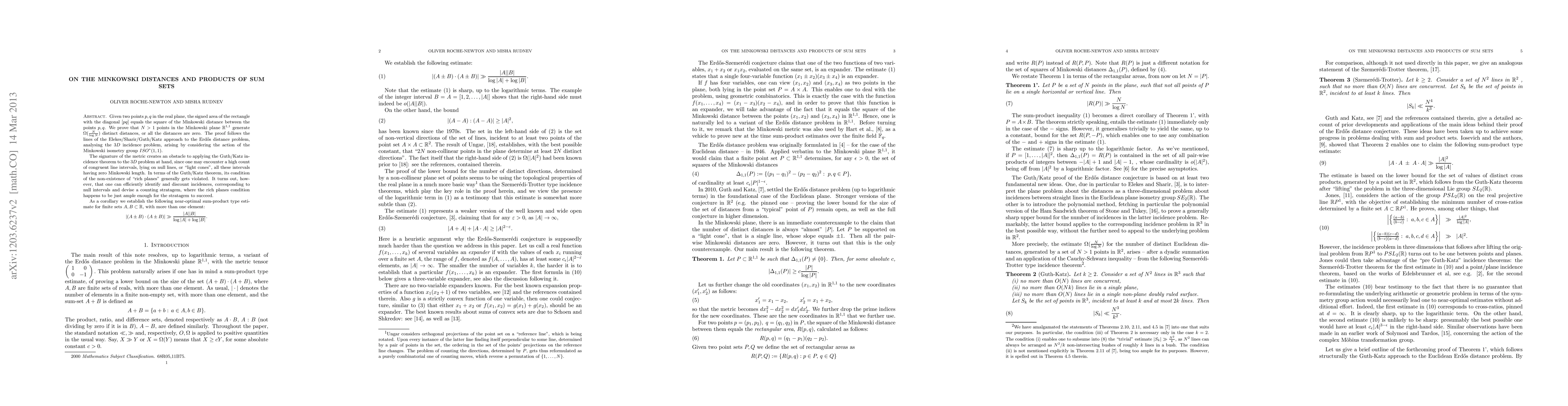 This research paper proves that N>1 points in the Minkowski plane generate Omega(N/log N) distinct Minkowski distances, overcoming obstacles posed by null lines or 'light cones'. It also establishes a near-optimal sum-product type estimate for finite sets A, B ⊂ ℝ, demonstrating that |(A±B)⋅(A±B)| ≳ |A||B|/(log|A| + log|B|). The methodology involves analyzing a 3D incidence problem and adapting the Elekes/Sharir/Guth/Katz approach to the Erdős distance problem.