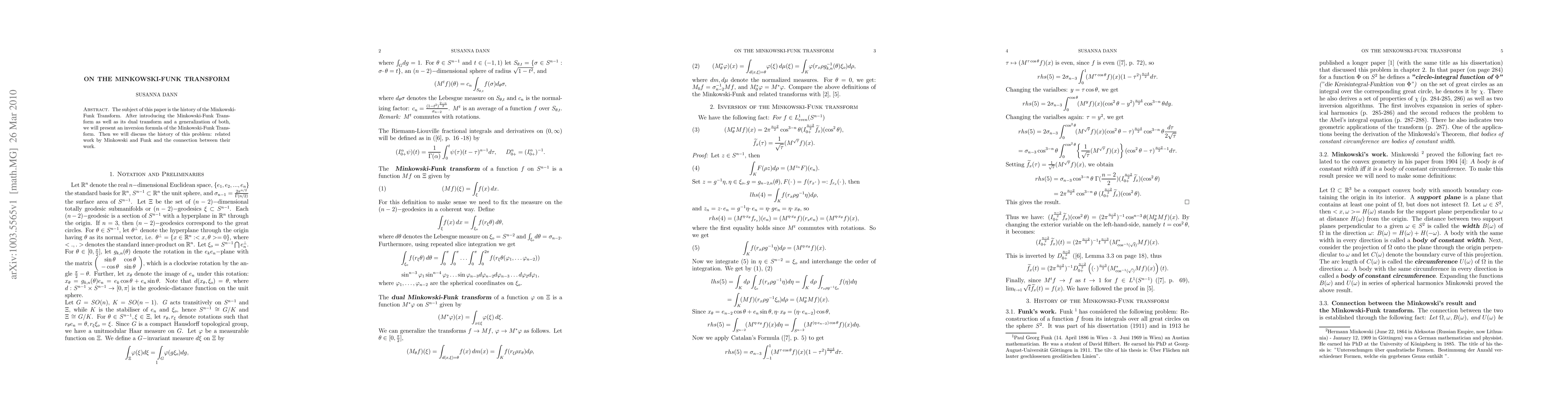 Summary: This paper provides a historical account of the Minkowski-Funk Transform, presents an inversion formula, and discusses the contributions of Minkowski and Funk, establishing their connection in the development of the transform.