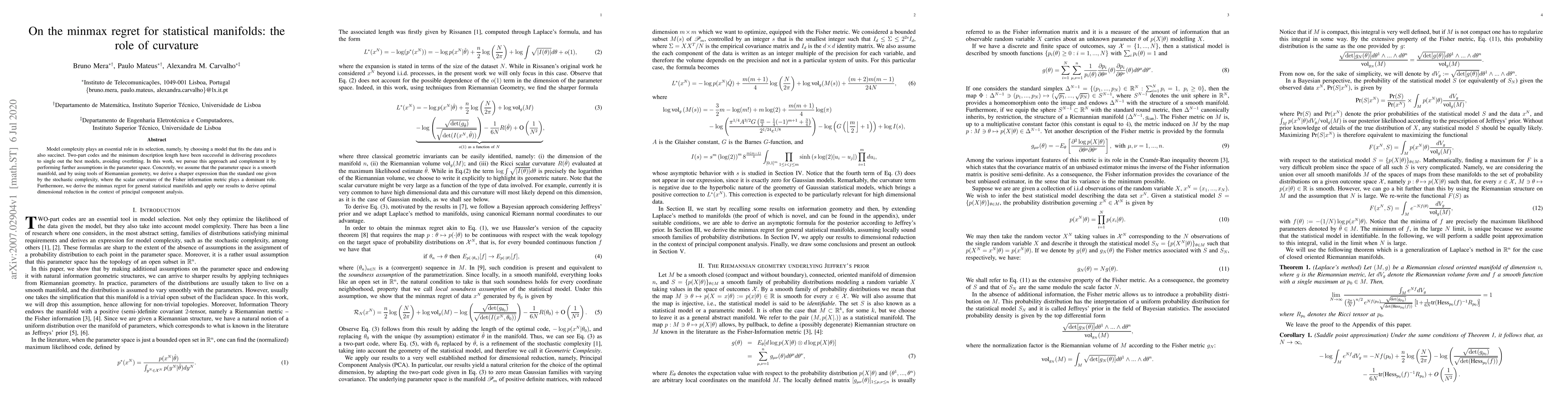 Model complexity plays an essential role in its selection, namely, by choosing a model that fits the data and is also succinct. Two-part codes and the minimum description length have been successful in delivering procedures to single out the best models, avoiding overfitting. In this work, we pursue this approach and complement it by performing further assumptions in the parameter space. Concretely, we assume that the parameter space is a smooth manifold, and by using tools of Riemannian geometry, we derive a sharper expression than the standard one given by the stochastic complexity, where the scalar curvature of the Fisher information metric plays a dominant role. Furthermore, we derive the minmax regret for general statistical manifolds and apply our results to derive optimal dimensional reduction in the context of principal component analysis.