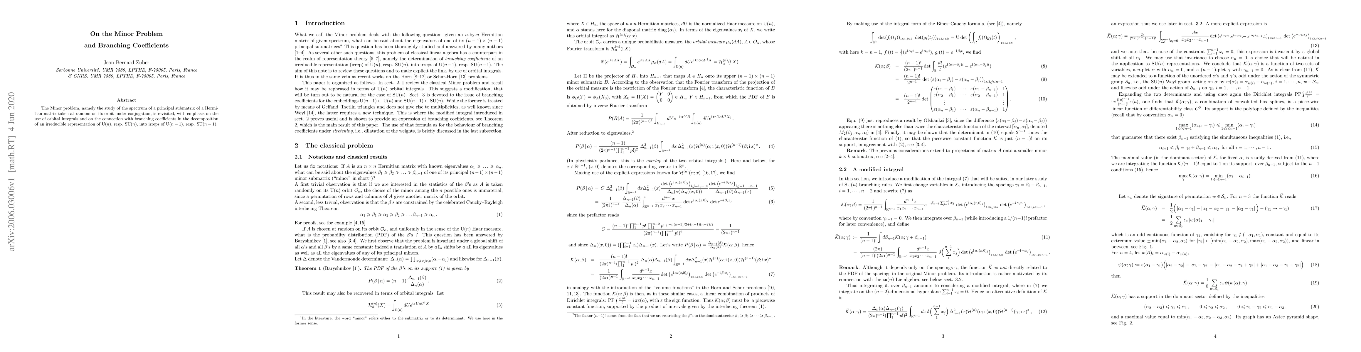 The Minor problem, namely the study of the spectrum of a principal submatrix of a Hermitian matrix taken at random on its orbit under conjugation, is revisited, with emphasis on the use of orbital integrals and on the connection with branching coefficients in the decomposition of an irreducible representation of U(n), resp. SU(n), into irreps of U(n-1), resp. SU(n-1).