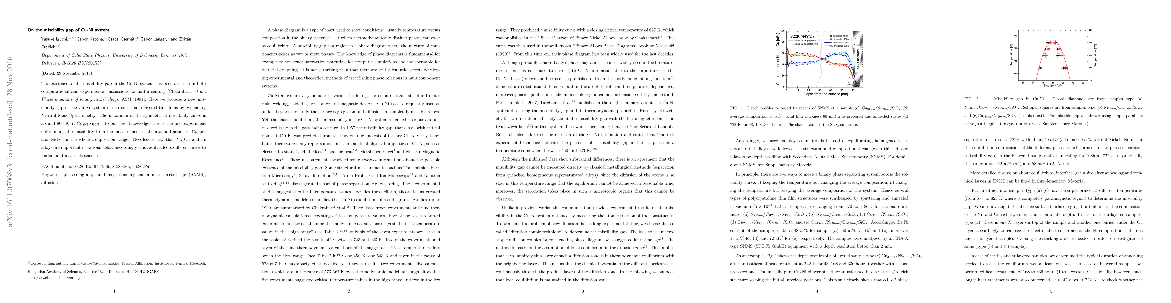 The existence of the miscibility gap in the Cu-Ni system has been an issue in both computational and experimental discussions for half a century [Chakrabarti et al., Phase diagrams of binary nickel alloys, ASM, 1991]. Here we propose a new miscibility gap in the Cu-Ni system measured in nano-layered thin films by Secondary Neutral Mass Spectrometry. The maximum of the symmetrical miscibility curve is around 800~K at Cu50%Ni50%. To our best knowledge, this is the first experiment determining the miscibility from the measurement of the atomic fraction of Copper and Nickel in the whole composition range. Needless to say that Ni, Cu and its alloys are important in various fields, accordingly this result affects different areas to understand materials sciences.