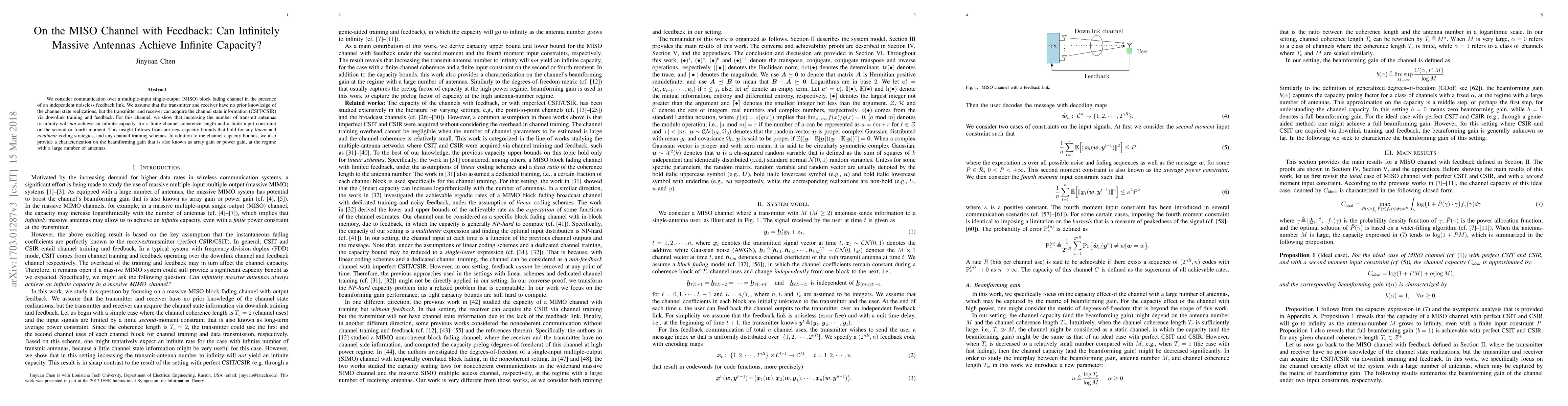 Increasing antennas in a MISO channel with feedback does not achieve infinite capacity, even for an infinitely massive antenna array.