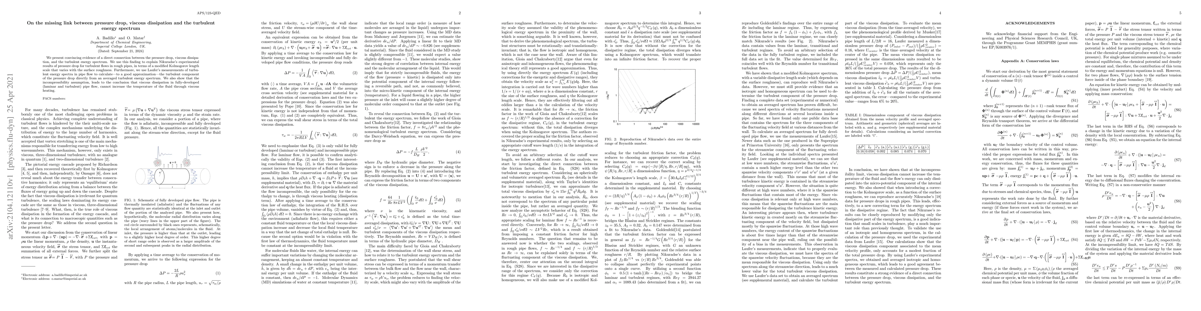 This paper establishes a direct link between pressure drop, viscous dissipation, and the turbulent energy spectrum, explaining Nikuradse's pressure drop results in rough pipes via a modified Kolmogorov length scale. It also approximates the turbulent component of pressure drop from an averaged turbulent energy spectrum, concluding that viscous dissipation does not increase fluid temperature in fully-developed pipe flow.