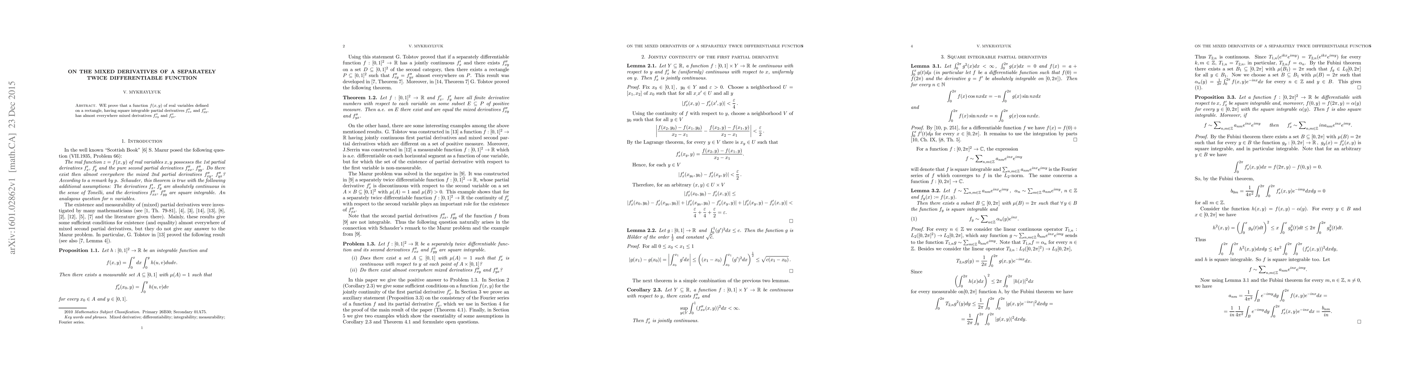 We prove that a function $f(x,y)$ of real variables defined on a rectangle, having square integrable partial derivatives $f"_{xx}$ and $f"_{yy}$, has almost everywhere mixed derivatives $f"_{xy}$ and $f"_{yx}$.