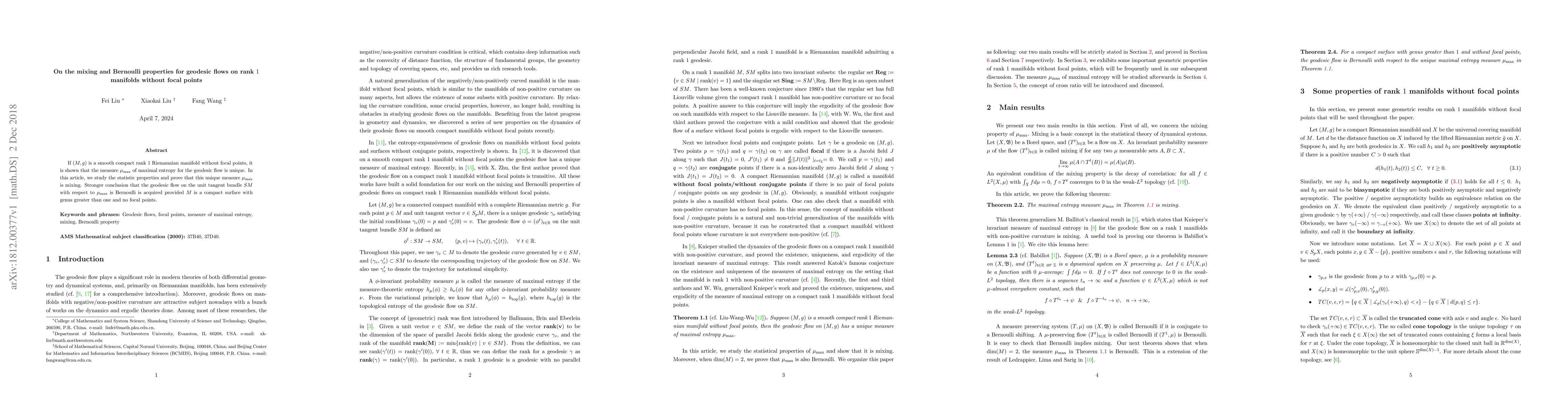 This paper demonstrates that for a smooth compact rank 1 Riemannian manifold without focal points, the maximal entropy measure for the geodesic flow is unique and mixing. It further proves that the geodesic flow is Bernoulli under the condition that the manifold has genus greater than one and no focal points.