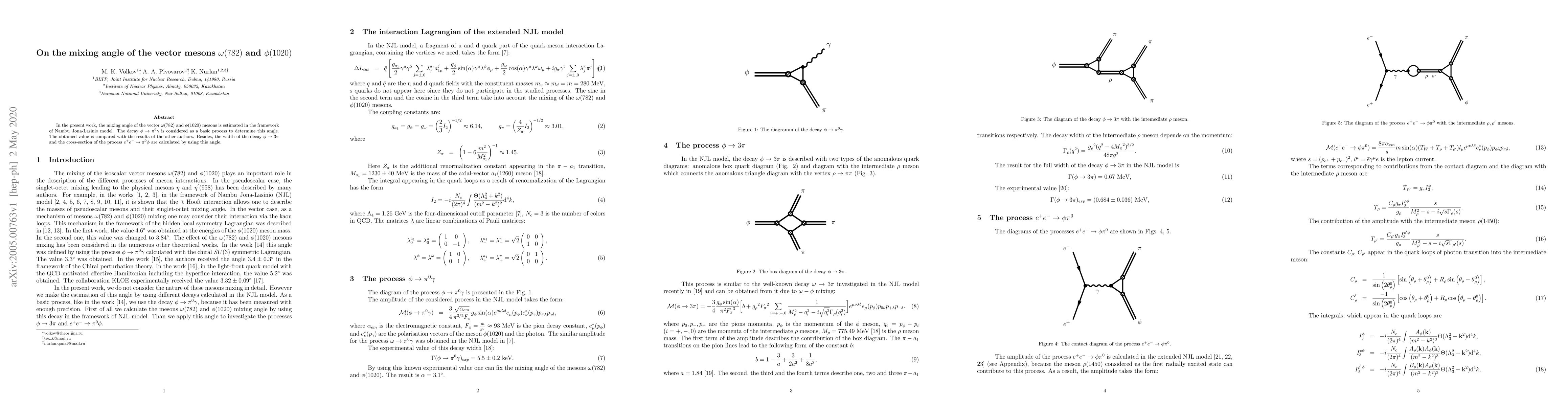 This paper estimates the mixing angle between vector mesons $\omega(782)$ and $\phi(1020)$ using the Nambu--Jona-Lasinio model, determining it via the decay $\phi \to \pi^{0} \gamma$. The results are compared with other studies and additional calculations include the decay width $\phi \to 3\pi$ and the cross-section for $e^{+}e^{-} \to \pi^{0} \phi$.