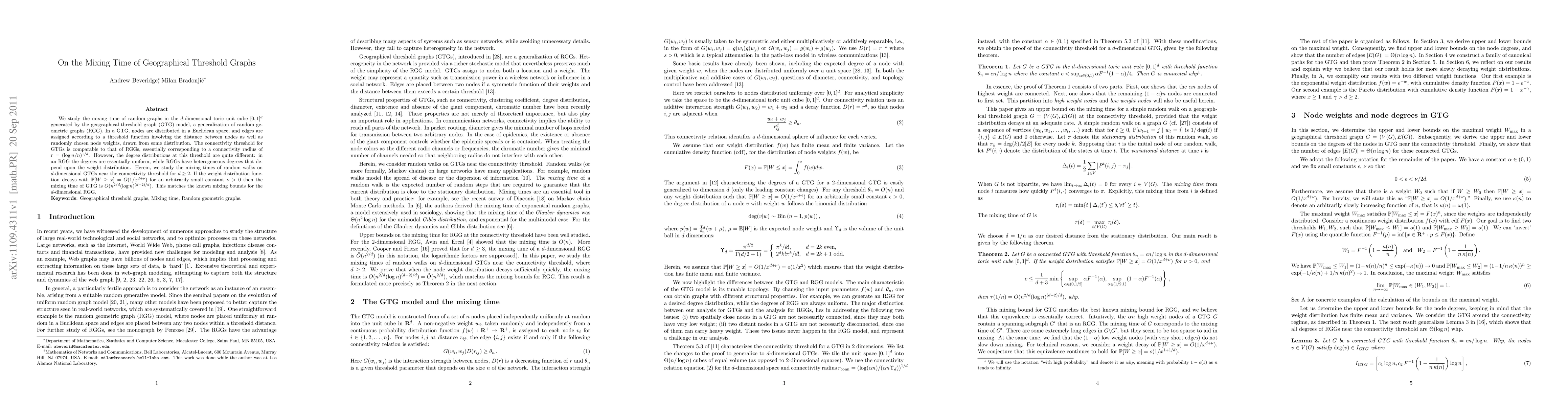We study the mixing time of random graphs in the $d$-dimensional toric unit cube $[0,1]^d$ generated by the geographical threshold graph (GTG) model, a generalization of random geometric graphs (RGG). In a GTG, nodes are distributed in a Euclidean space, and edges are assigned according to a threshold function involving the distance between nodes as well as randomly chosen node weights, drawn from some distribution. The connectivity threshold for GTGs is comparable to that of RGGs, essentially corresponding to a connectivity radius of $r=(\log n/n)^{1/d}$. However, the degree distributions at this threshold are quite different: in an RGG the degrees are essentially uniform, while RGGs have heterogeneous degrees that depend upon the weight distribution. Herein, we study the mixing times of random walks on $d$-dimensional GTGs near the connectivity threshold for $d \geq 2$. If the weight distribution function decays with $\mathbb{P}[W \geq x] = O(1/x^{d+\nu})$ for an arbitrarily small constant $\nu>0$ then the mixing time of GTG is $\mixbound$. This matches the known mixing bounds for the $d$-dimensional RGG.