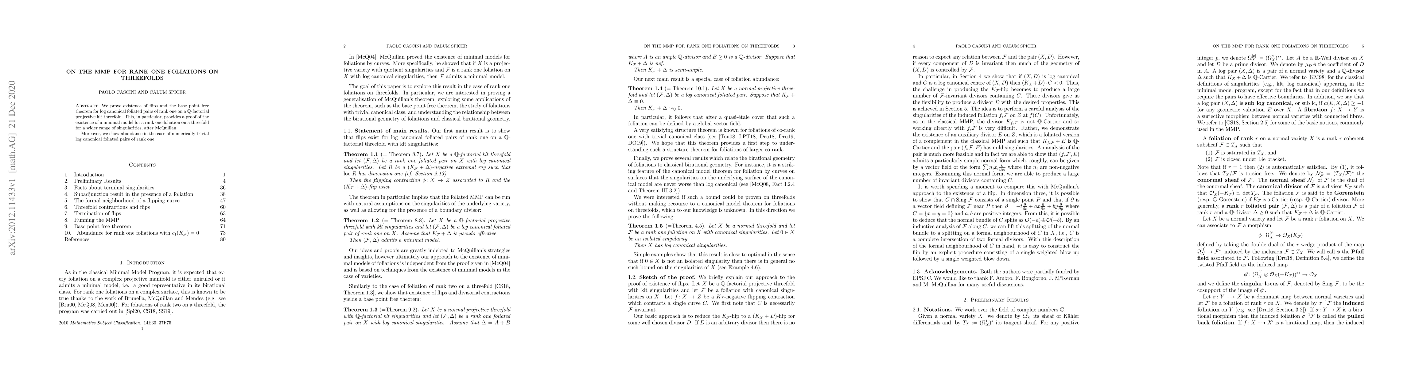 We prove existence of flips and the base point free theorem for log canonical foliated pairs of rank one on a Q-factorial projective klt threefold. This, in particular, provides a proof of the existence of a minimal model for a rank one foliation on a threefold for a wider range of singularities, after McQuillan. Moreover, we show abundance in the case of numerically trivial log canonical foliated pairs of rank one.