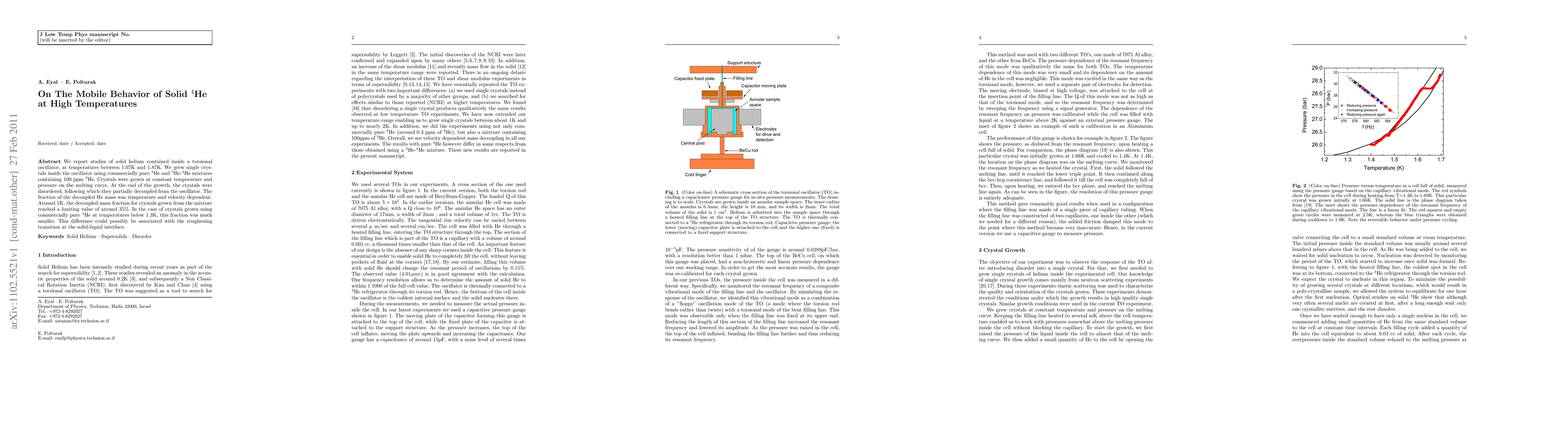 We report studies of solid helium contained inside a torsional oscillator, at temperatures between 1.07K and 1.87K. We grew single crystals inside the oscillator using commercially pure $^4$He and $^3$He-$^4$He mixtures containing 100 ppm $^3$He. Crystals were grown at constant temperature and pressure on the melting curve. At the end of the growth, the crystals were disordered, following which they partially decoupled from the oscillator. The fraction of the decoupled He mass was temperature and velocity dependent. Around 1K, the decoupled mass fraction for crystals grown from the mixture reached a limiting value of around 35%. In the case of crystals grown using commercially pure $^4$He at temperatures below 1.3K, this fraction was much smaller. This difference could possibly be associated with the roughening transition at the solid-liquid interface.