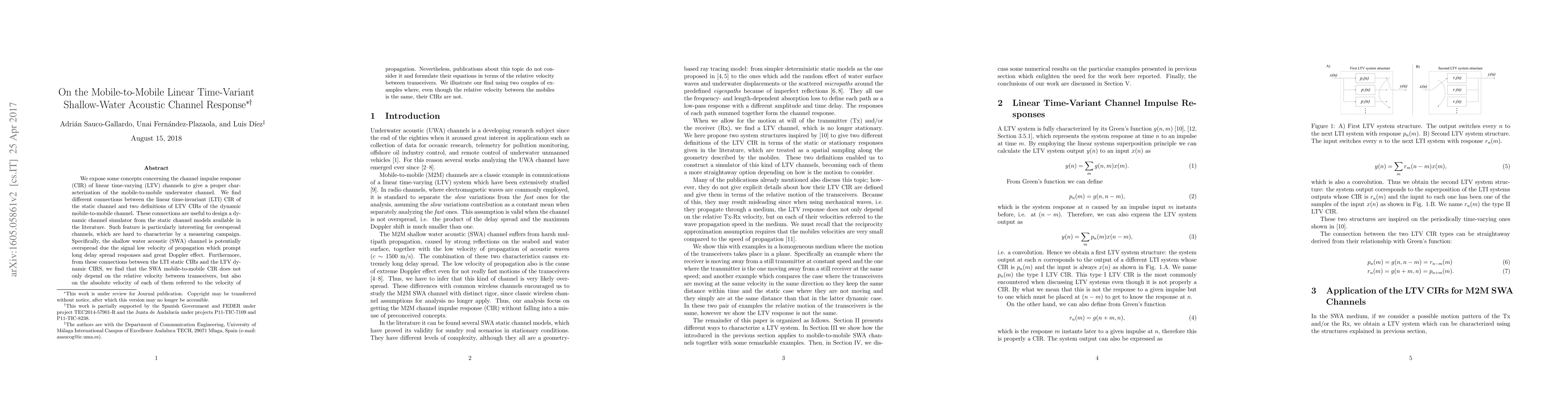 This paper explores the channel impulse response (CIR) of linear time-varying (LTV) mobile-to-mobile underwater acoustic channels, revealing connections between static and dynamic CIRs. It highlights that the shallow water acoustic (SWA) channel's CIR depends not only on relative but also on absolute transceiver velocities, a factor often overlooked in existing models.
