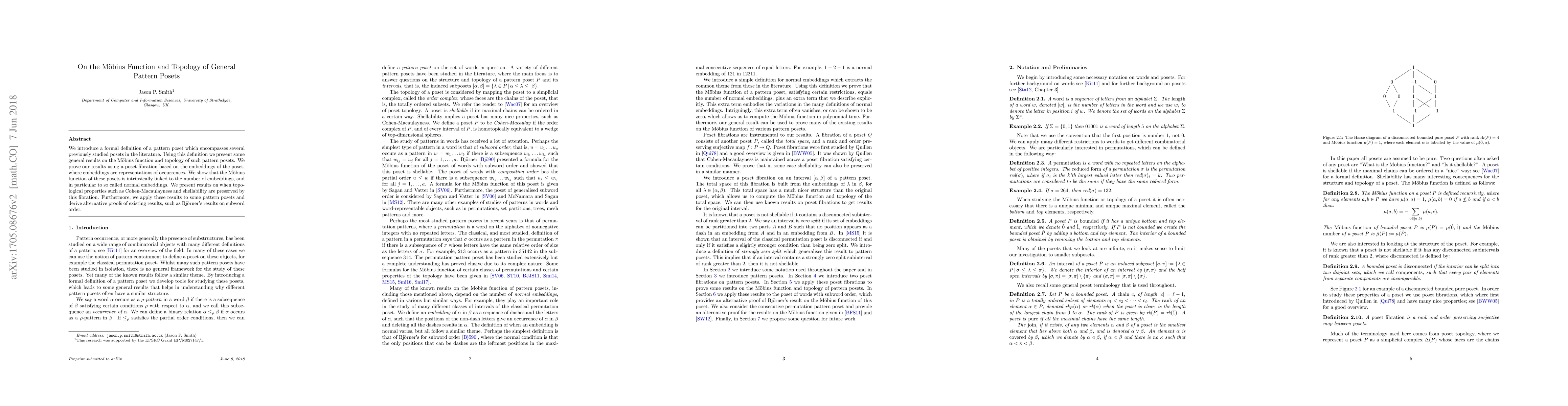 This paper defines a pattern poset and explores its M\"obius function and topological properties through poset fibration based on embeddings. It establishes connections between the M\"obius function and normal embeddings, and investigates Cohen-Macaulayness and shellability preservation.