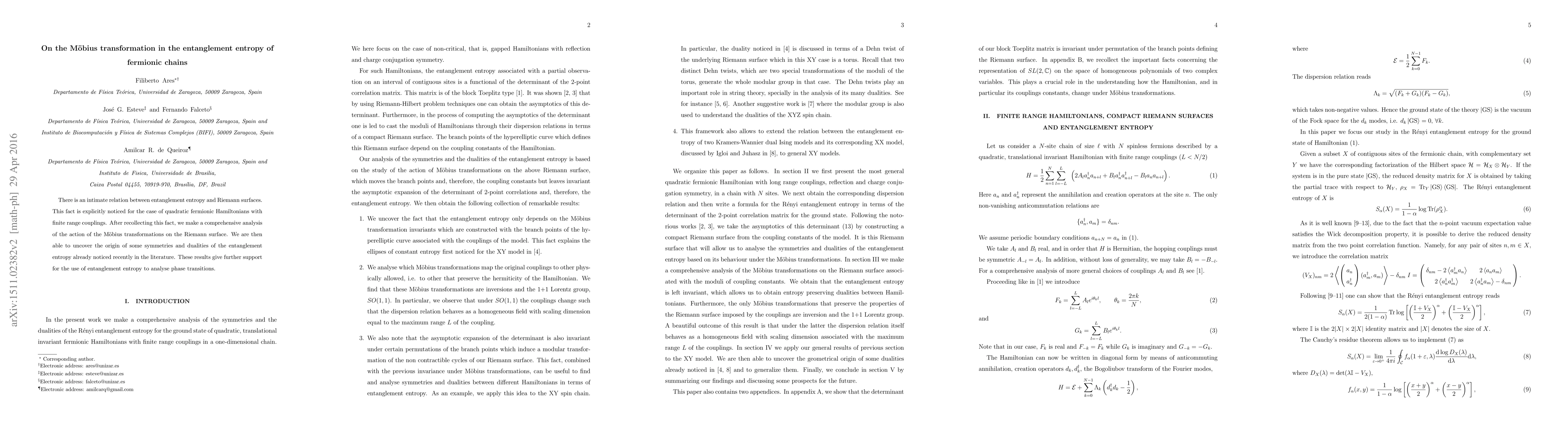 This paper explores how M"obius transformations affect entanglement entropy in fermionic chains, revealing a deeper connection between entanglement and Riemann surfaces.