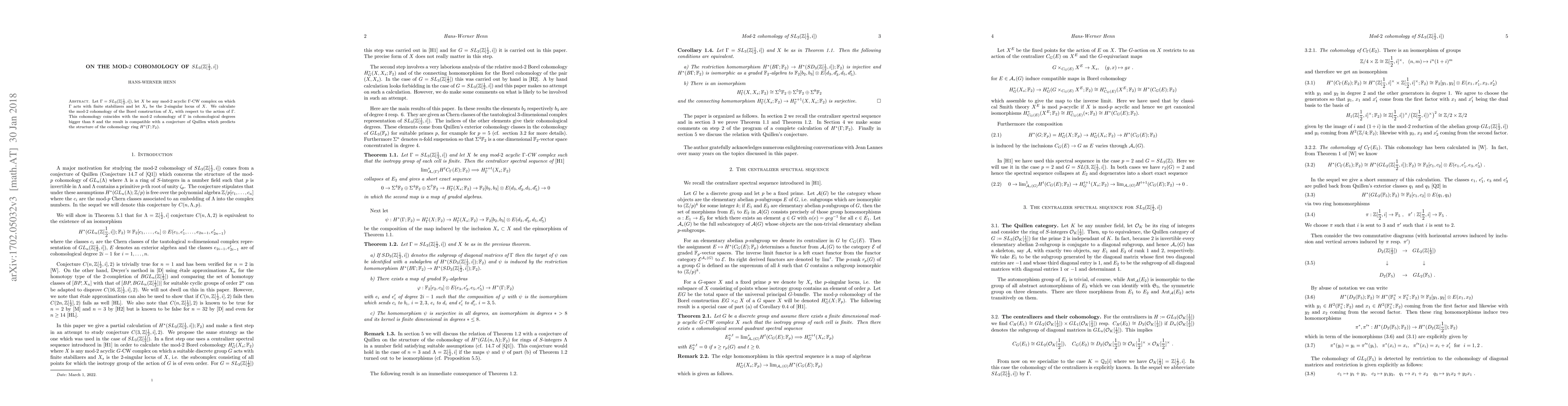 Let $\Gamma$ = SL 3 (Z[ 1 2 , i]), let X be any mod-2 acyclic $\Gamma$-CW complex on which $\Gamma$ acts with finite stabilizers and let Xs be the 2-singular locus of X. We calculate the mod-2 cohomology of the Borel constructon of Xs with respect to the action of $\Gamma$. This cohomology coincides with the mod-2 cohomology of $\Gamma$ in cohomological degrees bigger than 8 and the result is compatible with a conjecture of Quillen which predicts the strucure of the cohomology ring H * ($\Gamma$; Z/2).