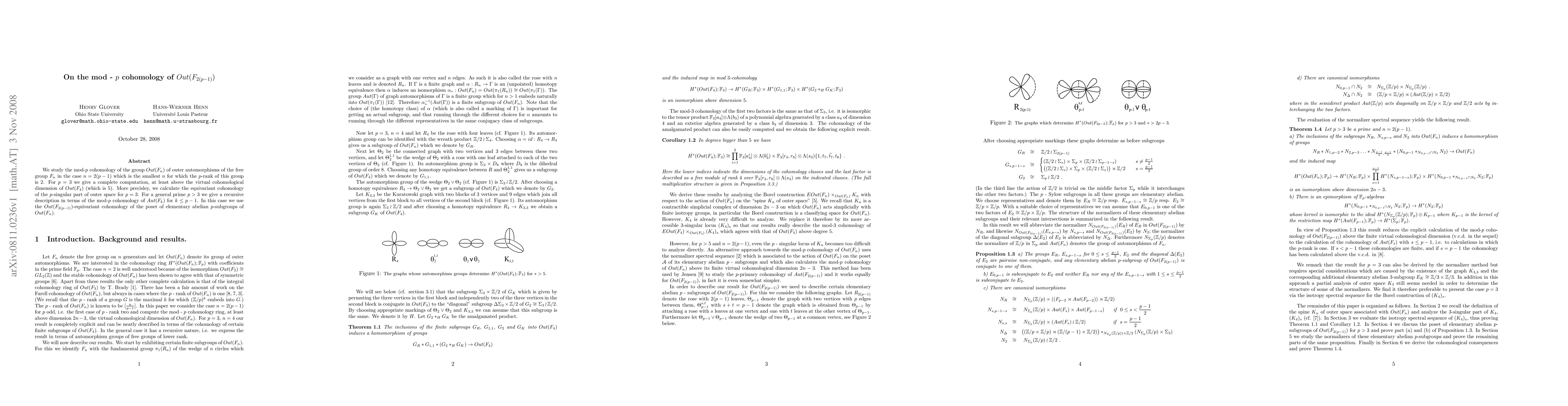 This paper computes the mod-p cohomology of Out(F_n) for n=2(p-1), focusing on p=3 in detail and providing a recursive description for p>3. It examines the equivariant cohomology of the p-singular part of outer space for p=3 and uses equivariant cohomology of subgroup posets for higher primes.