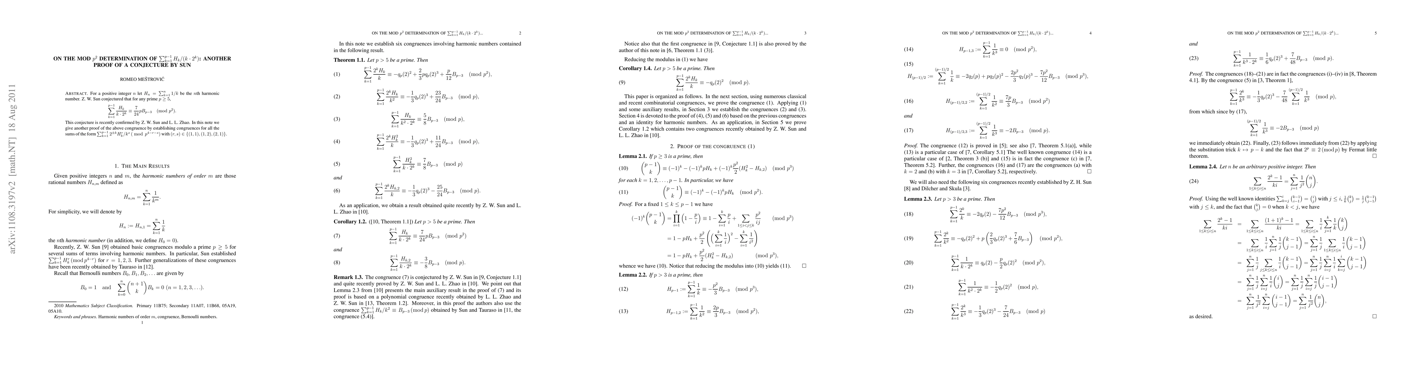 This paper provides an alternative proof for Sun's conjecture about a specific congruence relation involving harmonic numbers and powers of 2 modulo $p^2$, where $p$ is a prime greater than or equal to 5. The authors establish congruences for particular sums of the form $sum_{k=1}^{p-1}2^{pm k}H_k^r/k^s ,(mod{, p^{4-r-s}})$ with $(r,s)in{(1,1),(1,2),(2,1) }$.