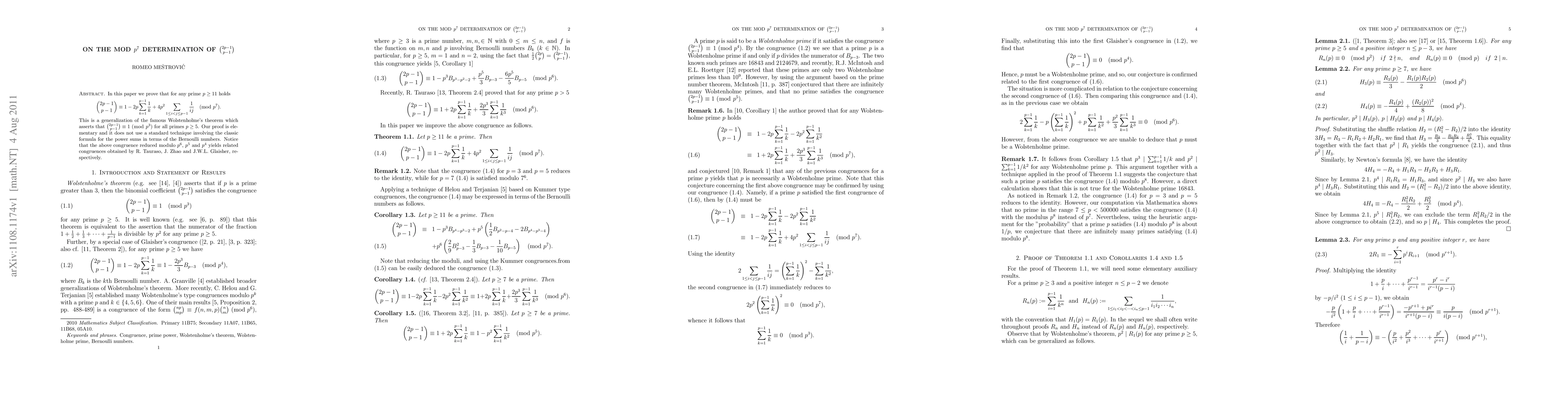 $$ {2p-1\choose p-1}\equiv 1 -2p \sum_{k=1}^{p-1}\frac{1}{k} +4p^2\sum_{1\le