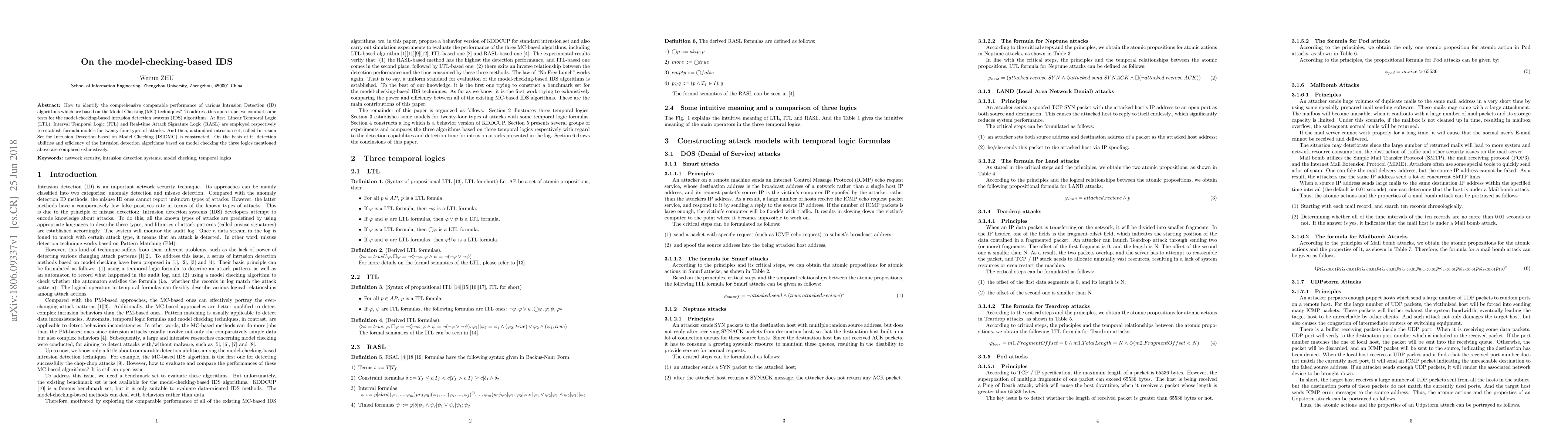 The paper constructs a benchmark set called ISIDMC for model-checking-based intrusion detection systems (IDS) algorithms, converting connection-oriented records from KDDCUP into step-oriented versions. It employs Linear Temporal Logic (LTL), Interval Temporal Logic (ITL), and Real-time Attack Signature Logic (RASL) to model various attacks and compares the detection abilities and efficiency of IDS algorithms based on these logics.
