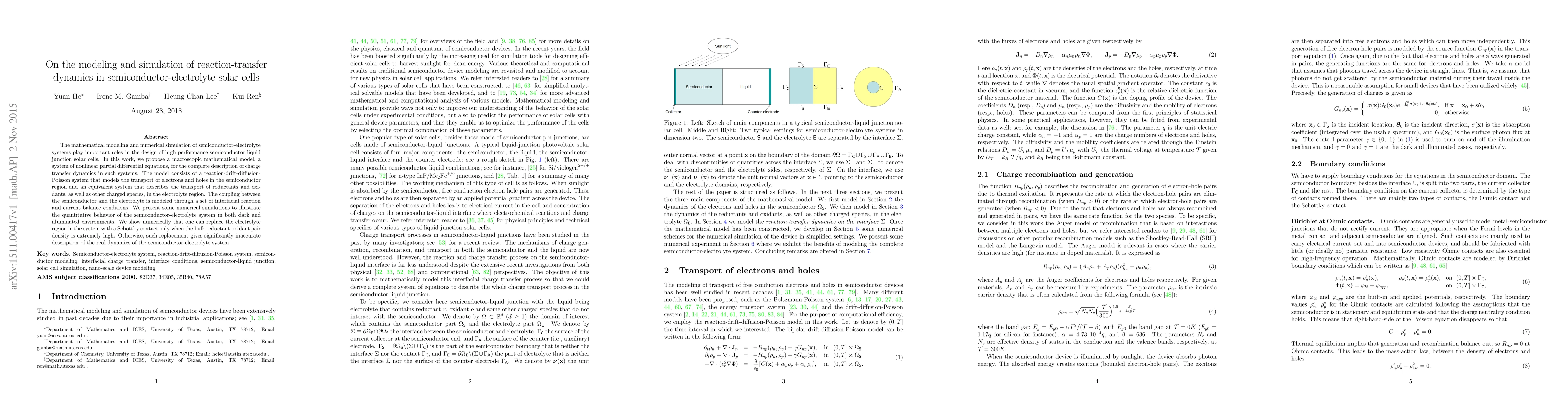 The mathematical modeling and numerical simulation of semiconductor-electrolyte systems play important roles in the design of high-performance semiconductor-liquid junction solar cells. In this work, we propose a macroscopic mathematical model, a system of nonlinear partial differential equations, for the complete description of charge transfer dynamics in such systems. The model consists of a reaction-drift-diffusion-Poisson system that models the transport of electrons and holes in the semiconductor region and an equivalent system that describes the transport of reductants and oxidants, as well as other charged species, in the electrolyte region. The coupling between the semiconductor and the electrolyte is modeled through a set of interfacial reaction and current balance conditions. We present some numerical simulations to illustrate the quantitative behavior of the semiconductor-electrolyte system in both dark and illuminated environments. We show numerically that one can replace the electrolyte region in the system with a Schottky contact only when the bulk reductant-oxidant pair density is extremely high. Otherwise, such replacement gives significantly inaccurate description of the real dynamics of the semiconductor-electrolyte system.