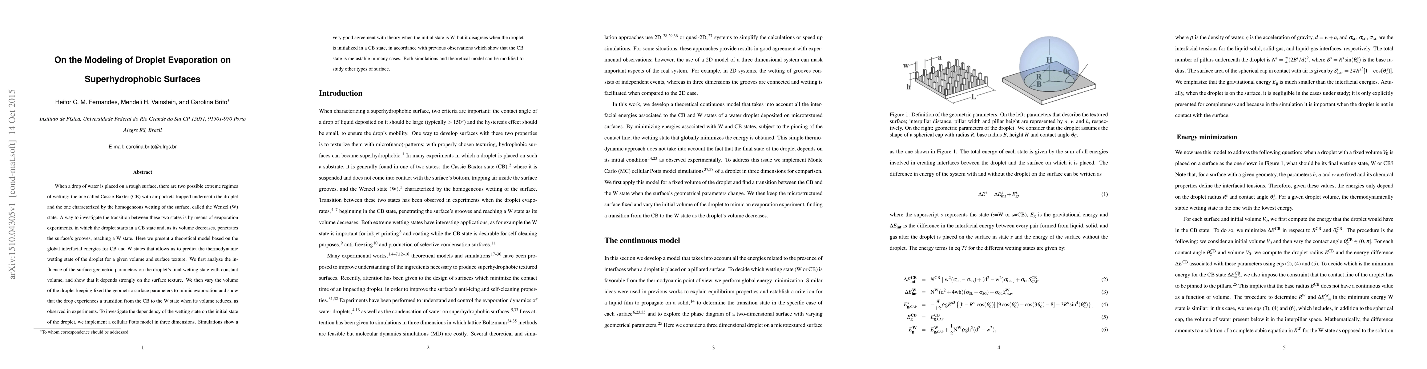When a drop of water is placed on a rough surface, there are two possible extreme regimes of wetting: the one called Cassie-Baxter (CB) with air pockets trapped underneath the droplet and the one characterized by the homogeneous wetting of the surface, called the Wenzel (W) state. A way to investigate the transition between these two states is by means of evaporation experiments, in which the droplet starts in a CB state and, as its volume decreases, penetrates the surface's grooves, reaching a W state. Here we present a theoretical model based on the global interfacial energies for CB and W states that allows us to predict the thermodynamic wetting state of the droplet for a given volume and surface texture. We first analyze the influence of the surface geometric parameters on the droplet's final wetting state with constant volume, and show that it depends strongly on the surface texture. We then vary the volume of the droplet keeping fixed the geometric surface parameters to mimic evaporation and show that the drop experiences a transition from the CB to the W state when its volume reduces, as observed in experiments. To investigate the dependency of the wetting state on the initial state of the droplet, we implement a cellular Potts model in three dimensions. Simulations show a very good agreement with theory when the initial state is W, but it disagrees when the droplet is initialized in a CB state, in accordance with previous observations which show that the CB state is metastable in many cases. Both simulations and theoretical model can be modified to study other types of surface.