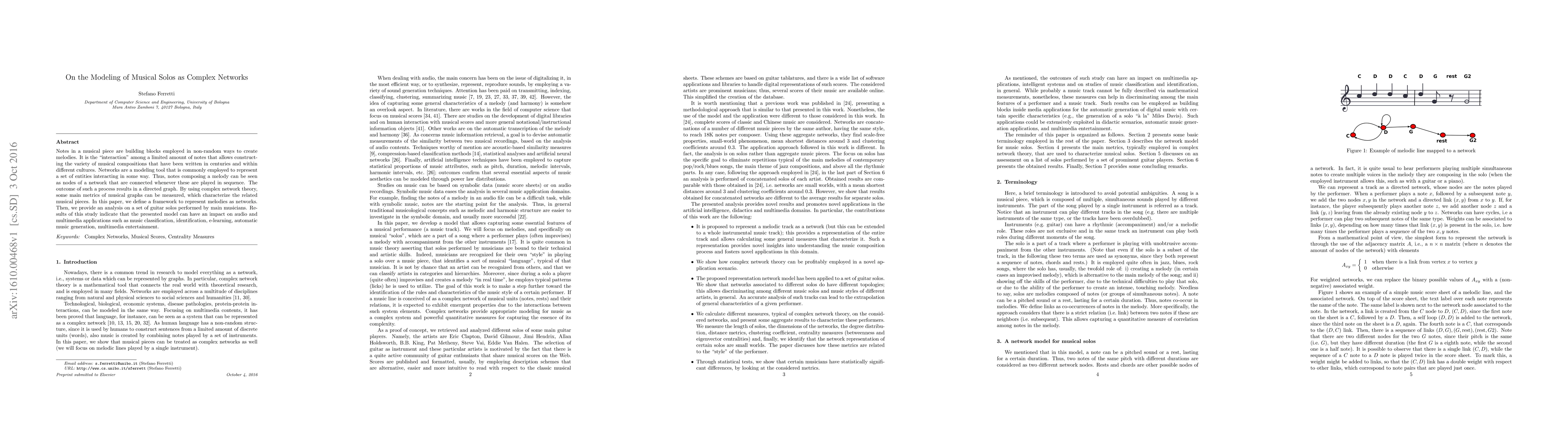 This paper proposes a framework to model musical solos as complex networks, where notes are nodes and sequential connections form directed graphs. The study analyzes guitar solos to demonstrate the potential of this approach for applications in music classification, identification, e-learning, automatic music generation, and multimedia entertainment.