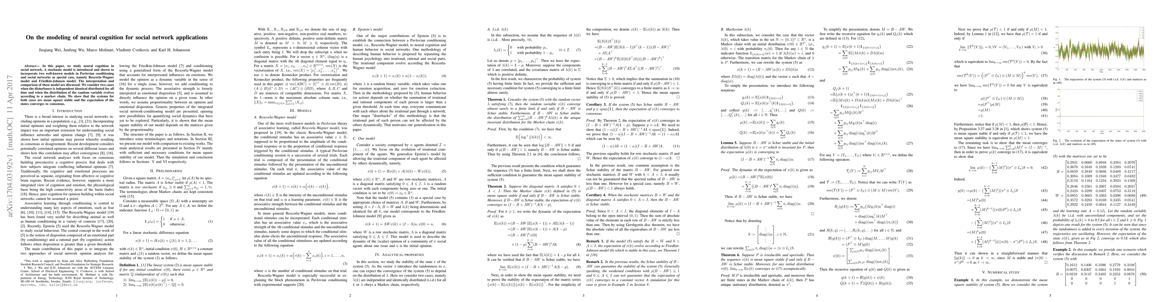 In this paper, we study neural cognition in social network. A stochastic model is introduced and shown to incorporate two well-known models in Pavlovian conditioning and social networks as special case, namely Rescorla-Wagner model and Friedkin-Johnsen model. The interpretation and comparison of these model are discussed. We consider two cases when the disturbance is independent identical distributed for all time and when the distribution of the random variable evolves according to a markov chain. We show that the systems for both cases are mean square stable and the expectation of the states converges to consensus.