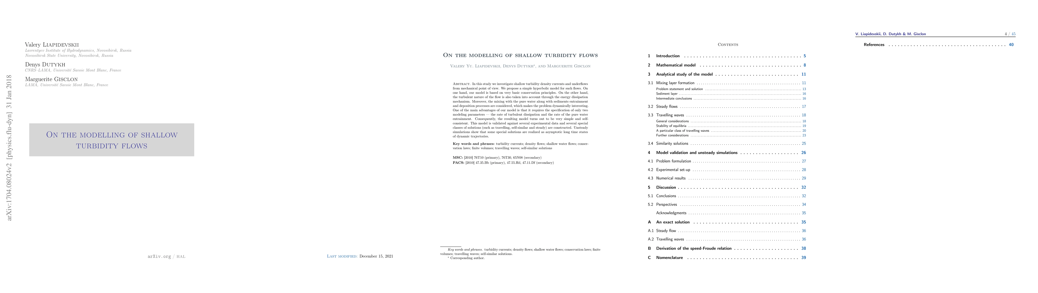 A simple hyperbolic model is proposed to simulate shallow turbidity flows, considering basic conservation principles and turbulent energy dissipation, with only two modeling parameters required.