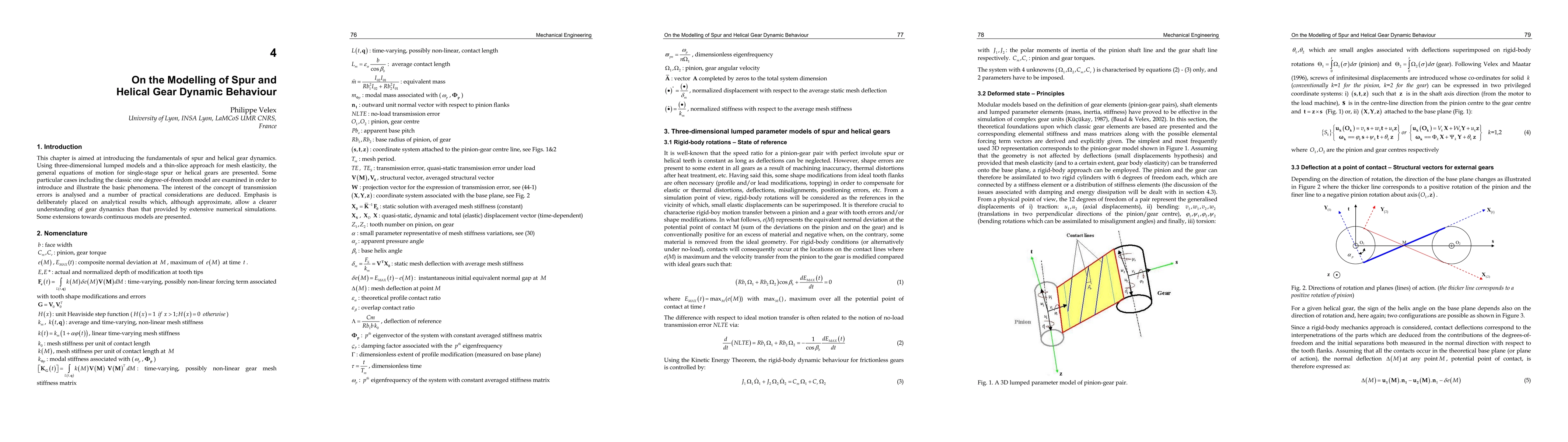 This chapter is aimed at introducing the fundamentals of spur and helical gear dynamics. Using three-dimensional lumped models and a thin-slice approach for mesh elasticity, the general equations of motion for single-stage spur or helical gears are presented. Some particular cases including the classic one degree-of-freedom model are examined in order to introduce and illustrate the basic phenomena. The interest of the concept of transmission errors is analysed and a number of practical considerations are deduced. Emphasis is deliberately placed on analytical results which, although approximate, allow a clearer understanding of gear dynamics than that provided by extensive numerical simulations. Some extensions towards continuous models are presented.