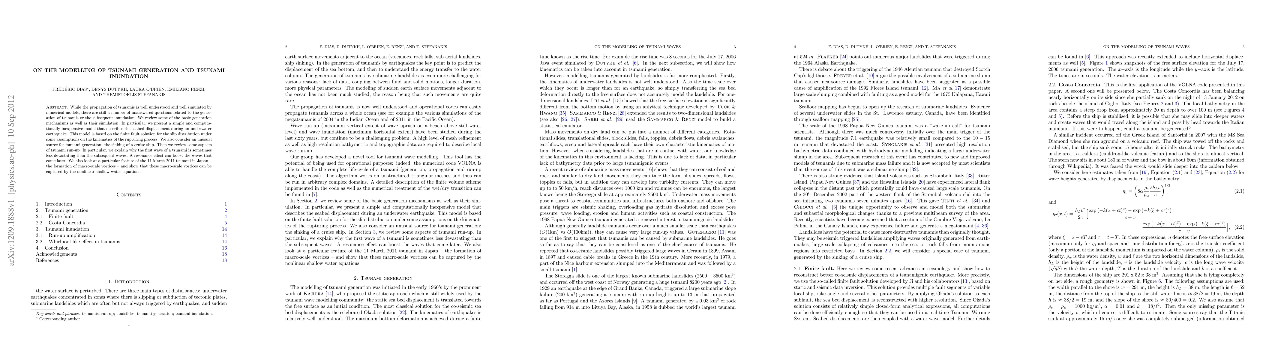 The paper reviews basic tsunami generation mechanisms, presents a simple model for seabed displacement during underwater earthquakes, and examines tsunami run-up using numerical simulations, including an unusual source like a sinking cruise ship.